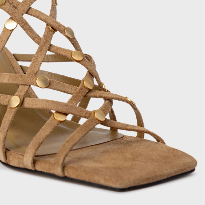 Sandália Tiras Studs Salto Uno Couro Suede Bege Almond