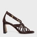 Sandália em couro suede, com salto levemente curvado e bico quadrado. Possui tiras que envolvem todo o pé até o fechamento por fivela ajustável, além adornos marcantes que trazem contraste ao modelo.