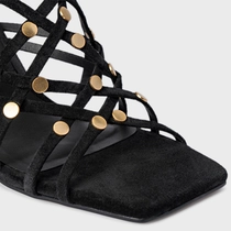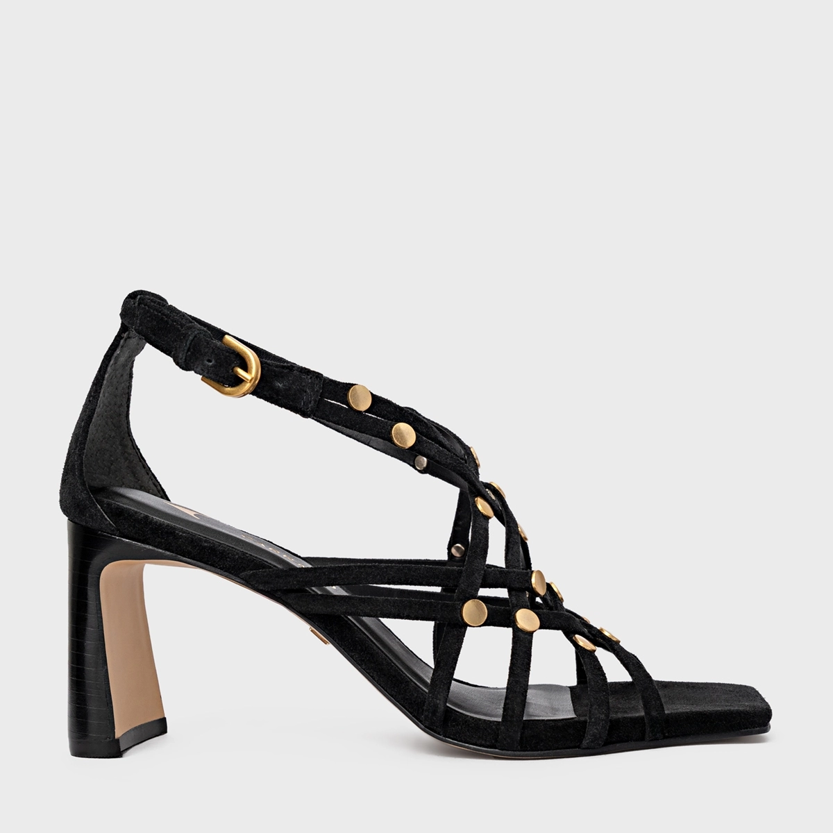 Sandália Tiras Studs Salto Uno Couro Suede Preto