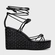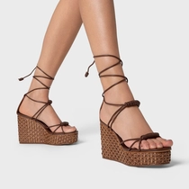 Sandália de couro com bico arredondado e salto anabela com acabamento em tressê. Possui três tiras trançadas sobre os dedos e outra sobre o peito do pé. Fechamento por amarração no tornozelo.