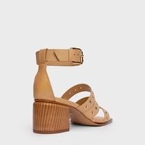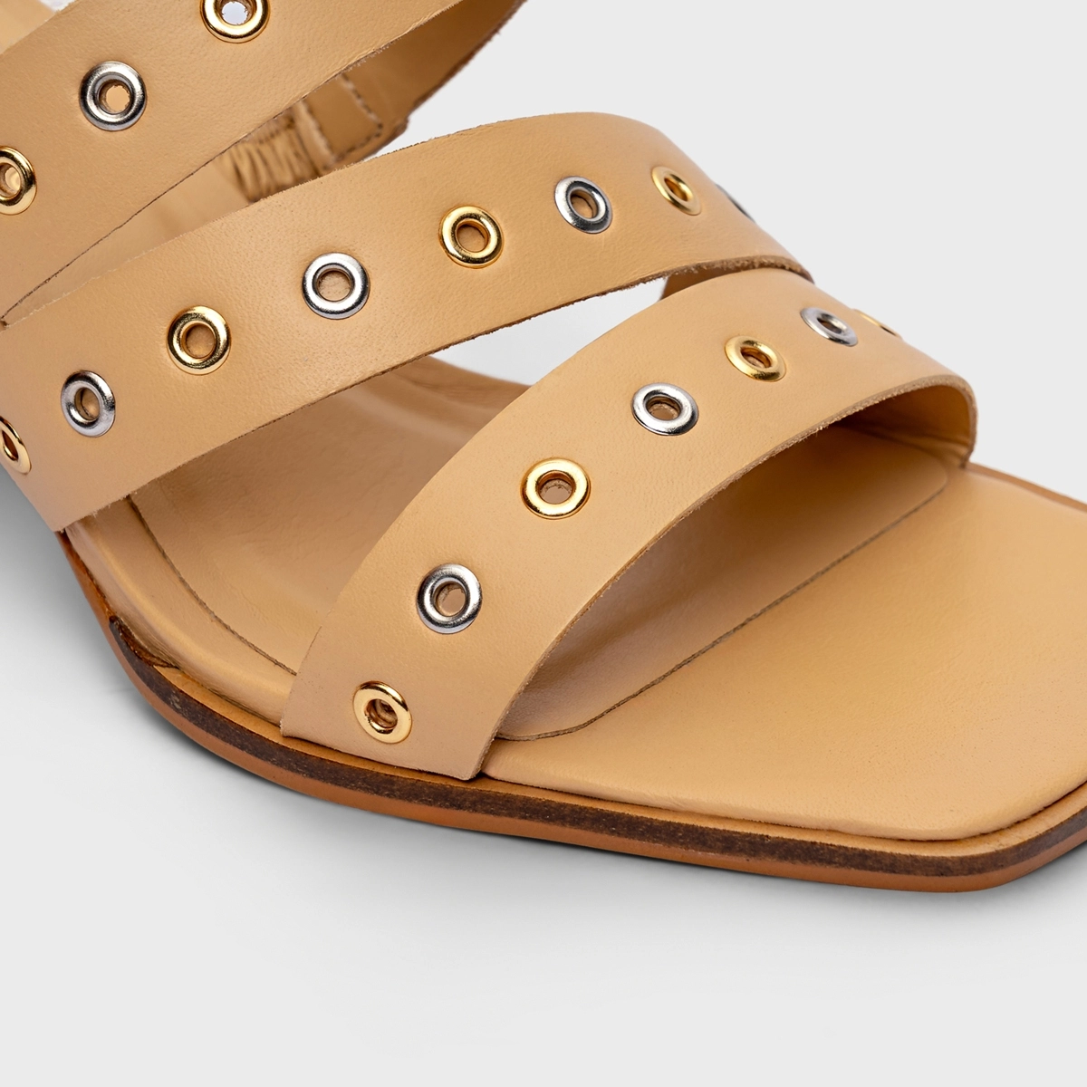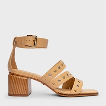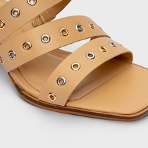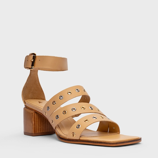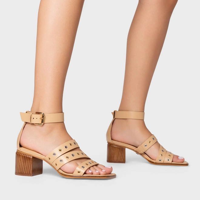 Sandália Triple Ilhós Salto Bloco Couro Bege Porcini