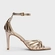 Sandália de couro com salto fino alto e bico levemente quadrado. Contém tiras finas entrelaçadas sobre os dedos e envolvendo o calcanhar. Possui fechamento por fivela ajustável no tornozelo.