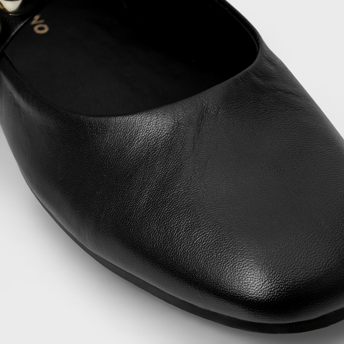 Sapatilha de couro com bico arredondado e salto bloco baixo. Destaque para a tira com esperas douradas no peito do pé, além de elástico traseiro e puxador que facilitam o calce.