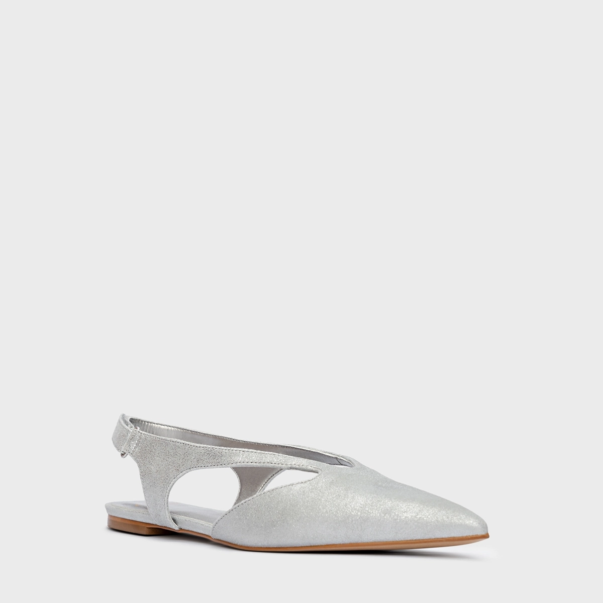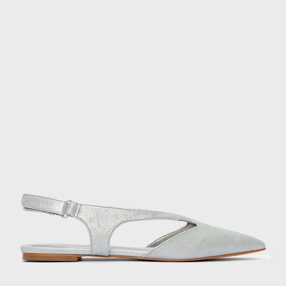Sapatilha de couro no estilo slingback. O modelo tem salto rasteiro e bico fino. Possui recorte no cabedal, abertura na parte lateral e traseira.