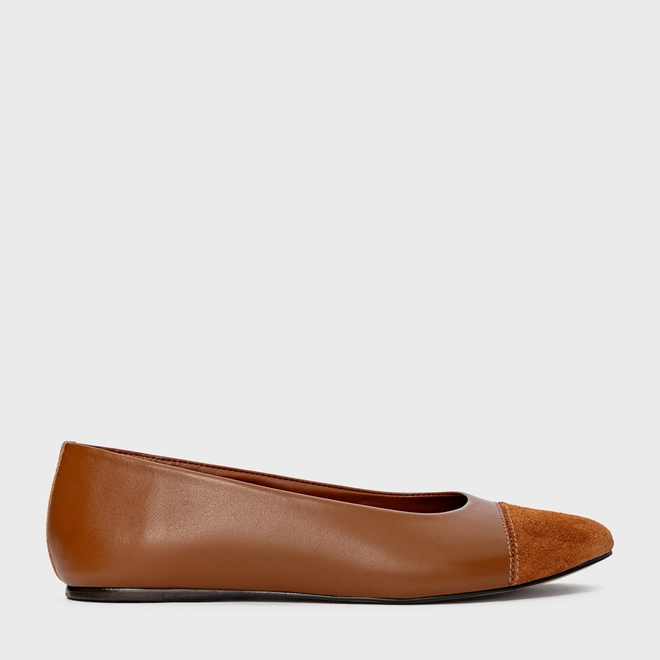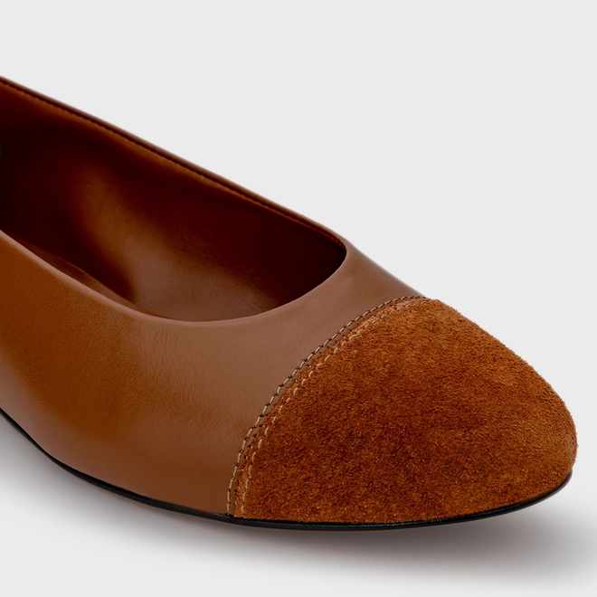 Sapatilha em couro com salto rasteiro e bico em couro suede criando um constrante com o restante do modelo.