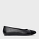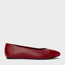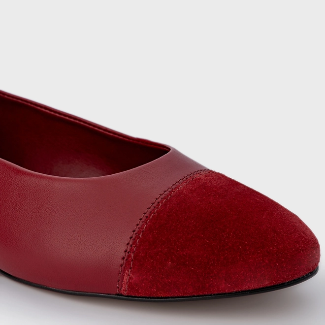 Sapatilha em couro com salto rasteiro e bico em couro suede criando um constrante com o restante do modelo.