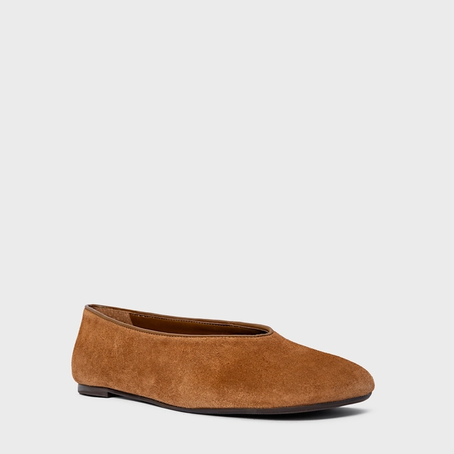 Sapatilha em couro suede, com ponteira e decote arredondado. Possui salto rasteiro e bico alongado.