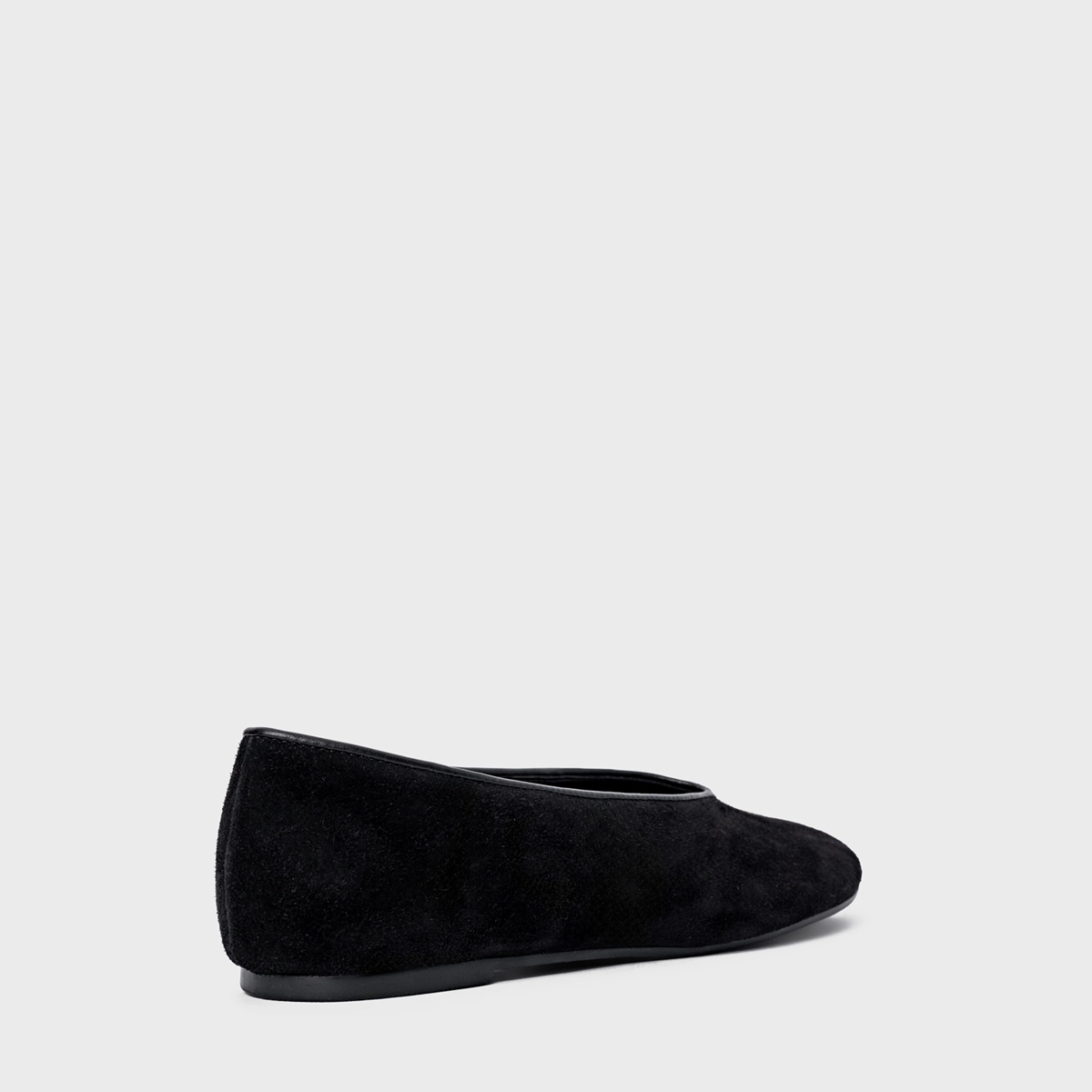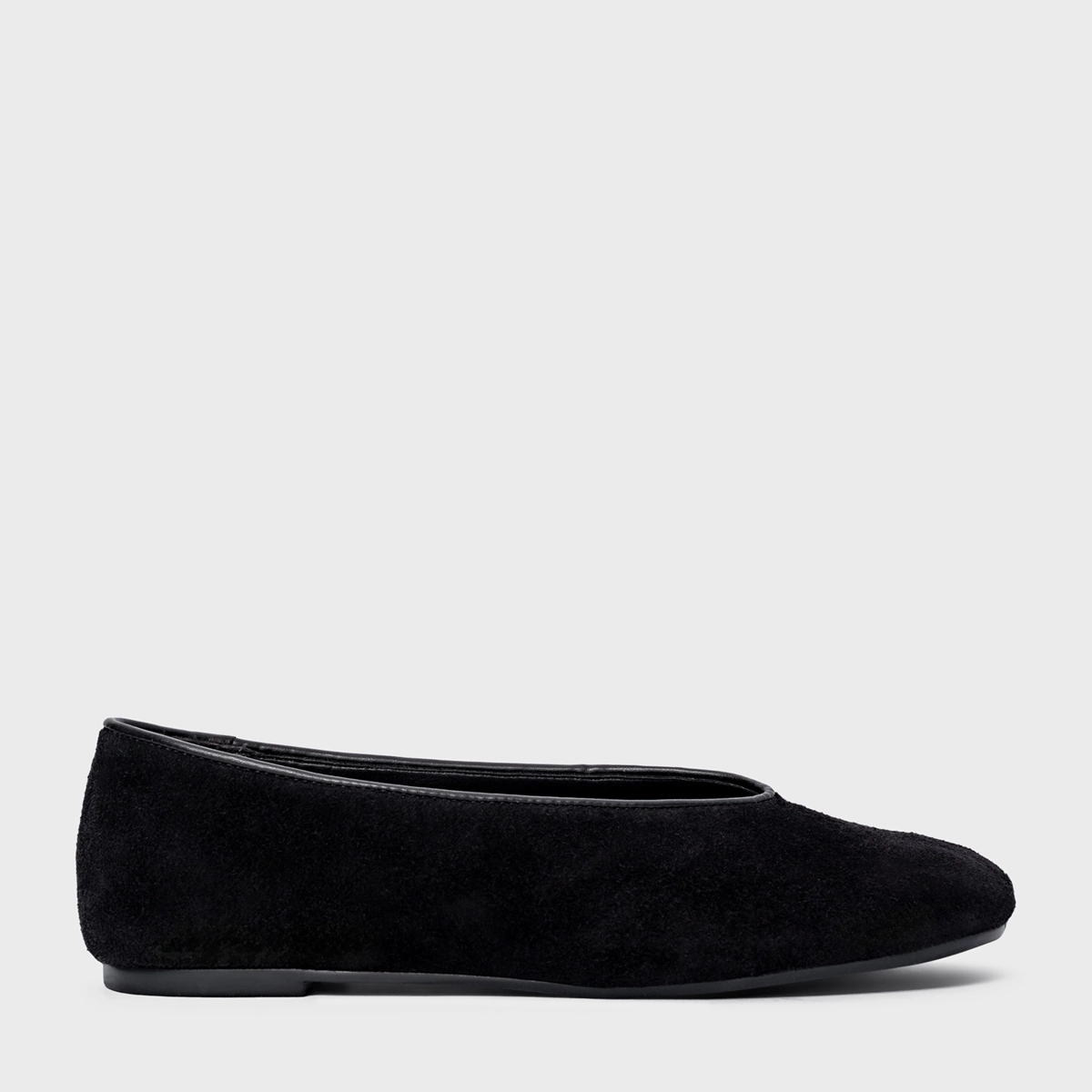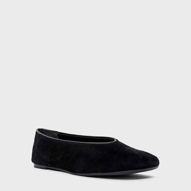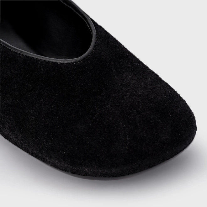 Sapatilha em couro suede, com ponteira e decote arredondado. Possui salto rasteiro e bico alongado.