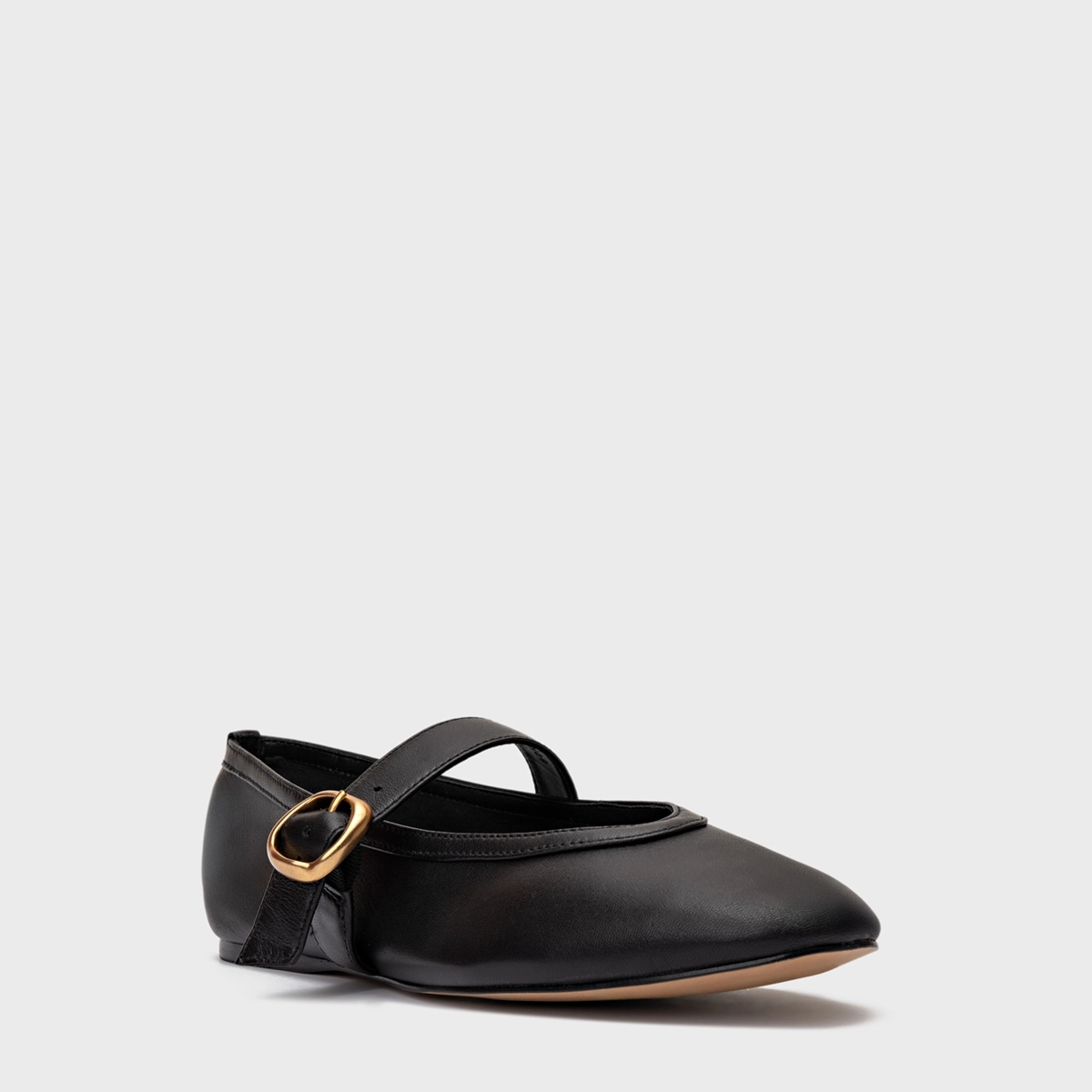 Sapatilha de couro com salto bloco baixo e bico arredondado. Conta com tira ajustável no peito do pé e fivela dourada arredondada.