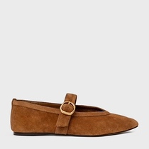 Sapatilha em couro suede com salto rasteiro e bico arredondado. Possui uma tira no peito do pé com fechamento por fivela em metal dourado.