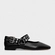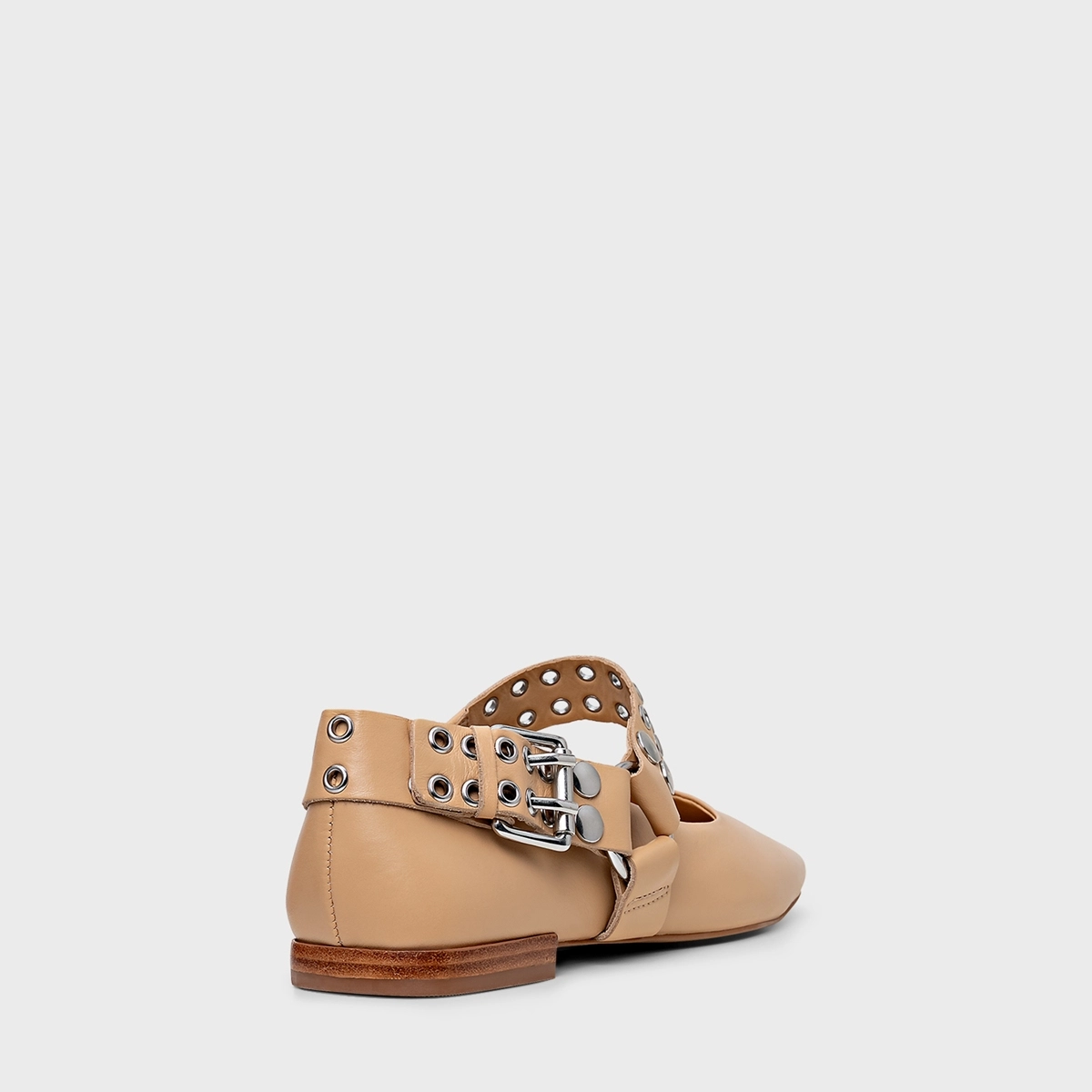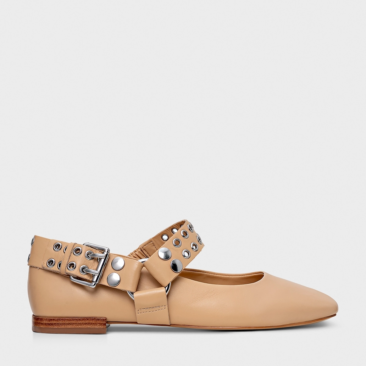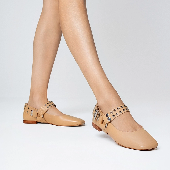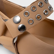 Sapatilha de couro com salto bloco baixo e bico levemente quadrado. Tira com studs e ilhoses vai do peito do pé à parte traseira. Elástico lateral oferece mais praticidade no calce.