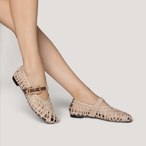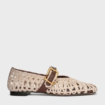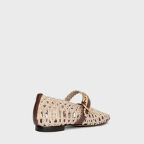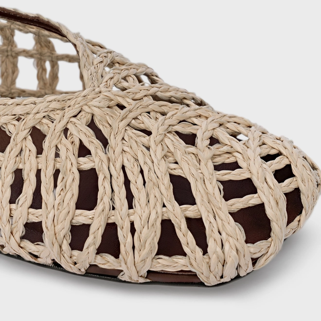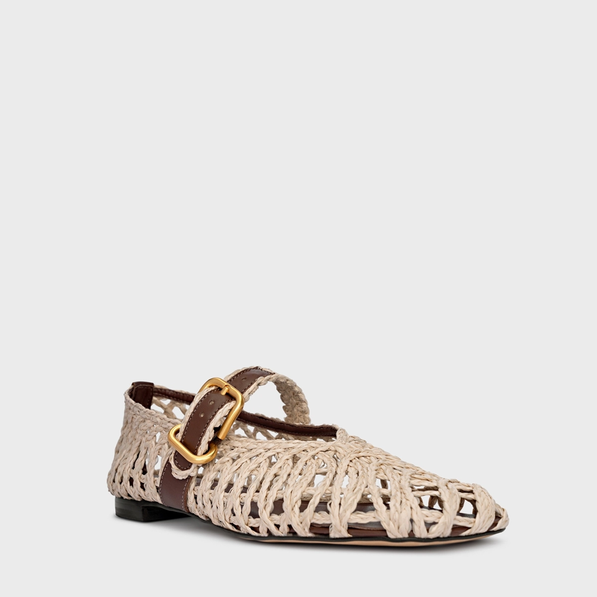 Sapatilha em palha tramada com bico levemente quadrado. Possui uma tira fina sobre o peito do pé com fivela para fechamento.