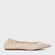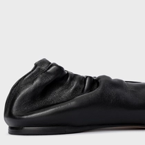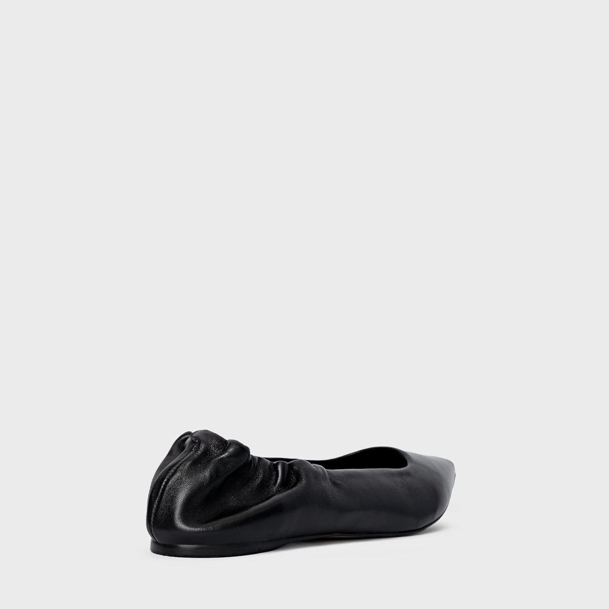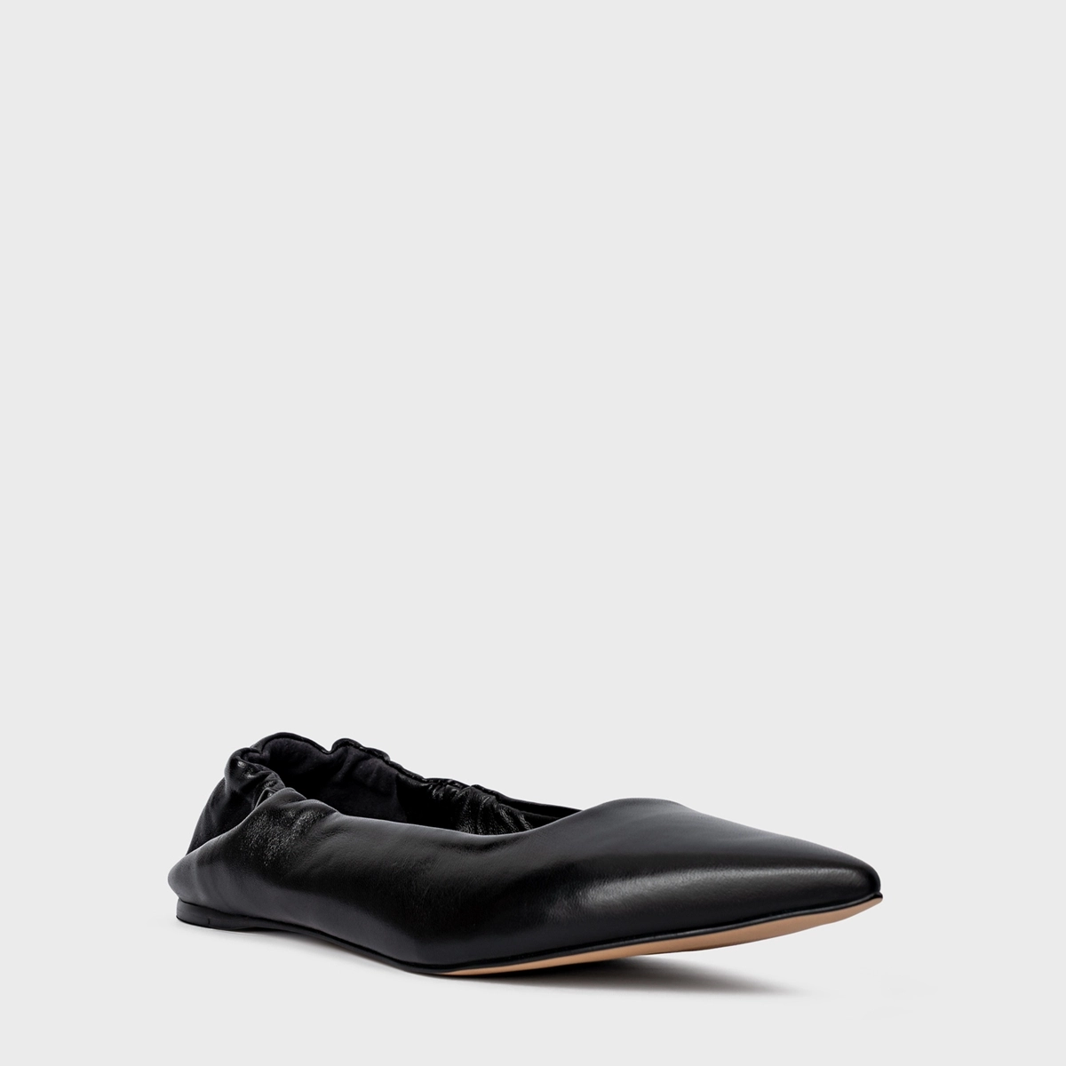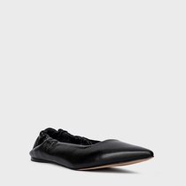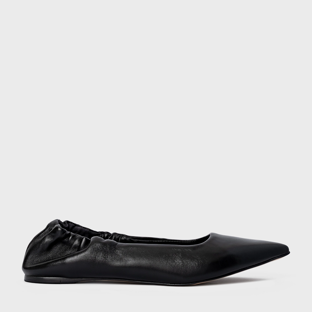 Sapatilha em couro com ponteira alongada, decote levemente quadrado e salto rasteiro. Contém elástico interno para facilitar o calce.