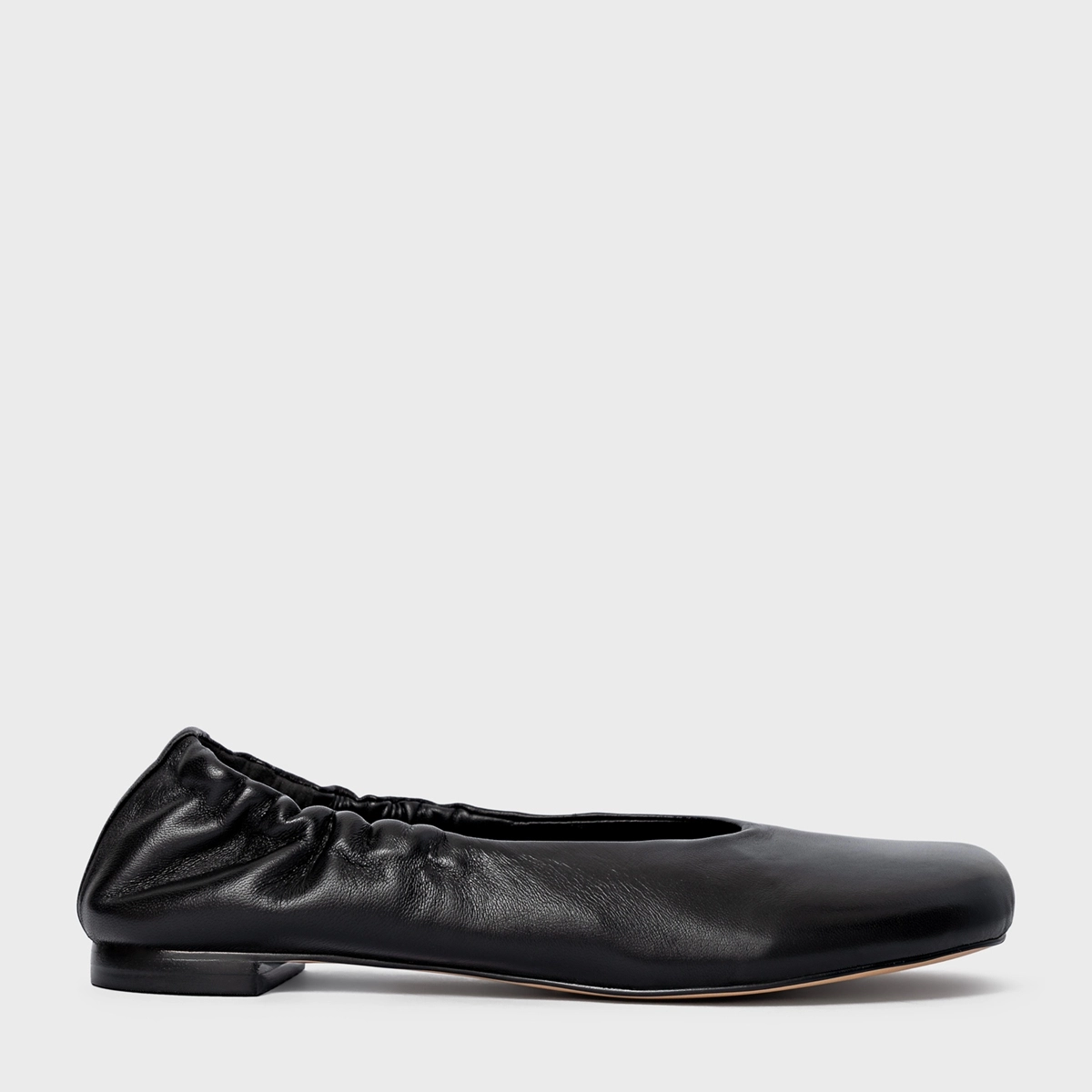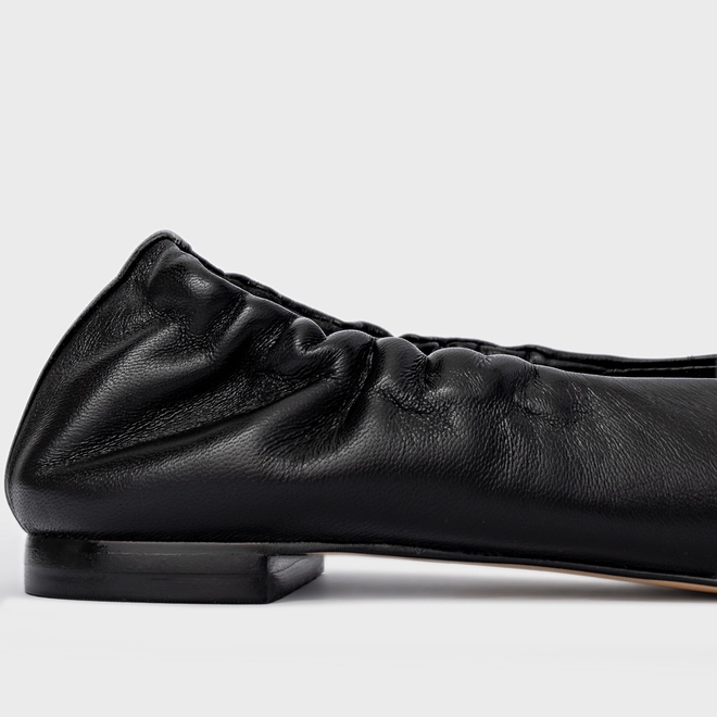 Sapatilha em couro com bico alongado quadrado, decote arredondado e salto bloco baixo. Contém elástico interno para facilitar o calce.