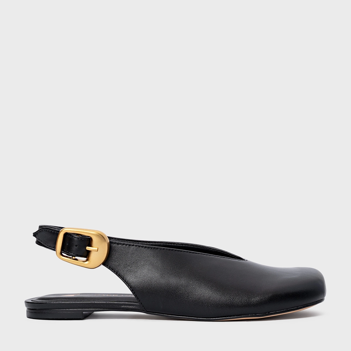 Sapatilha slingback em couro com bico quadrado alongado e salto rasteiro. Possui abertura traseira e fechamento por fivela dourada arredondada e ajustável.