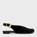 Sapatilha slingback em couro suede com bico quadrado alongado e salto rasteiro. Possui abertura traseira e fechamento por fivela dourada arredondada e ajustável.