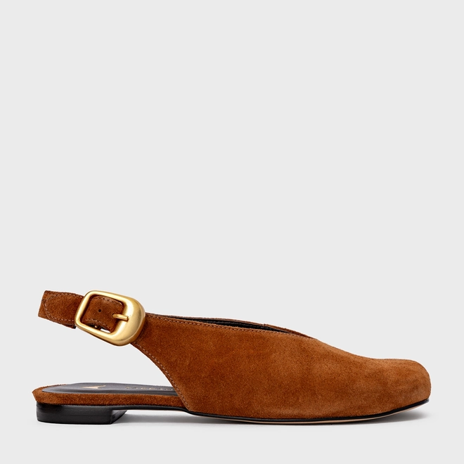 Sapatilha slingback em couro suede com bico quadrado alongado e salto rasteiro. Possui abertura traseira e fechamento por fivela dourada arredondada e ajustável.