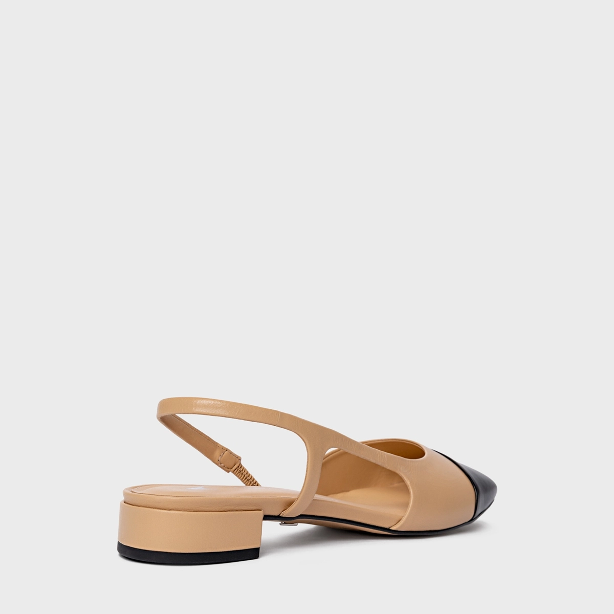 Sapatilha cap toe slingback de couro com salto bloco baixo e bico arredondado. Recortes laterais, biqueira contrastante, elástico para facilitar o calce.