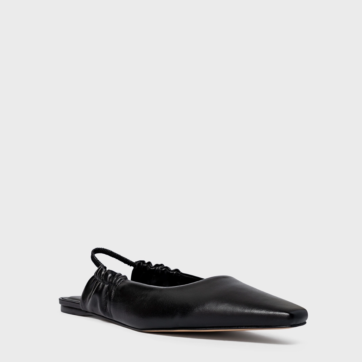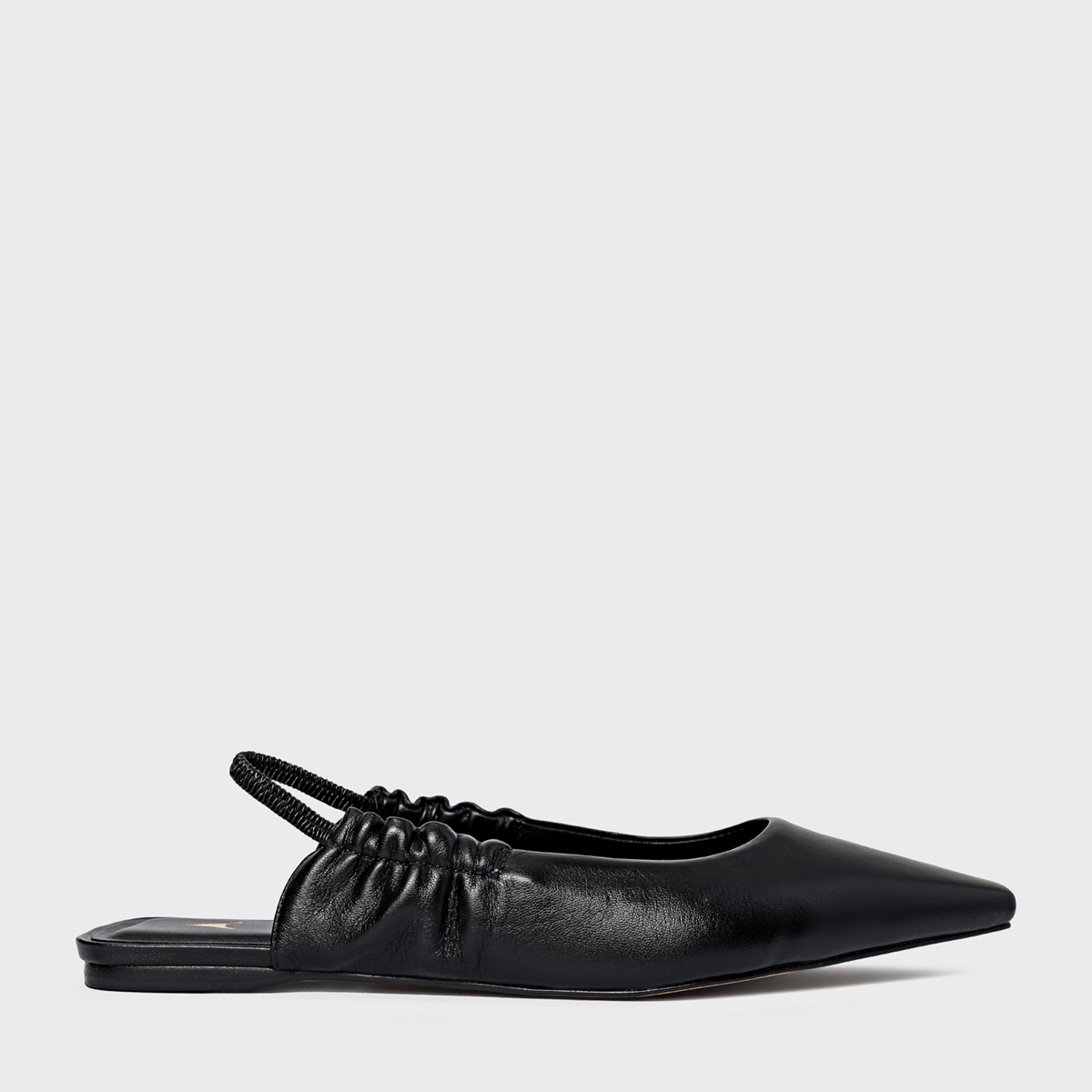 Sapatilha em couro com bico alongado e ponteira quadrada. Possui o salto rasteiro e abertura traseira.