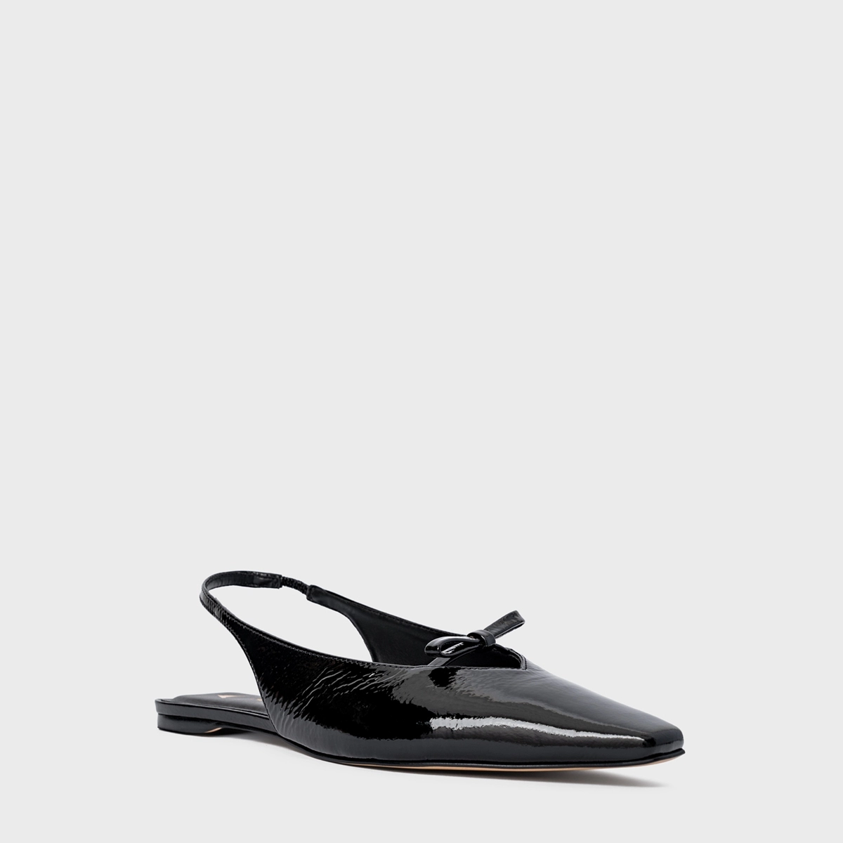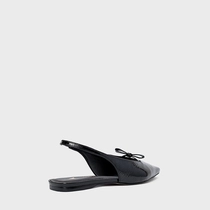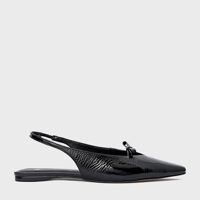Sapatilha slingback em couro verniz com bico alongado e ponteira quadrada. Salto rasteiro, detalhe de laço acima dos dedos, abertura traseira e fechamento em elástico para facilitar o calce.