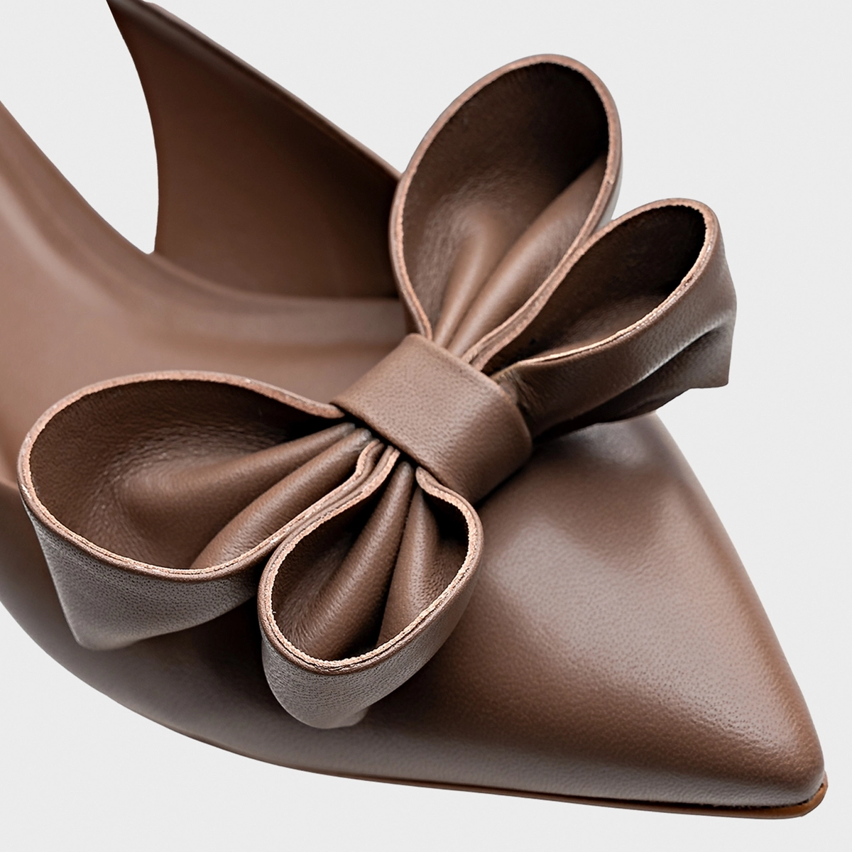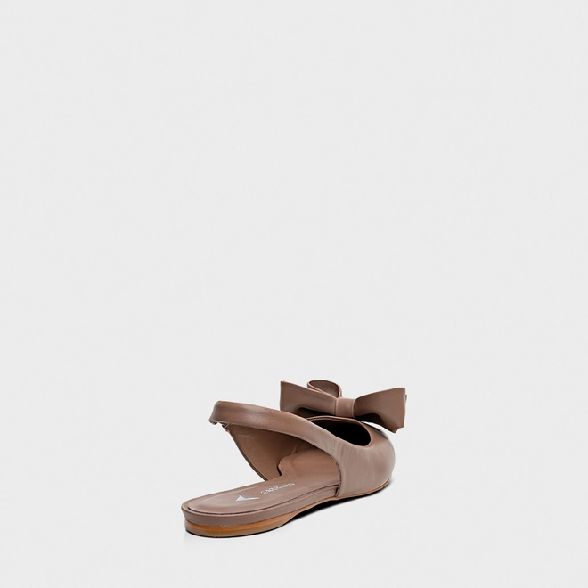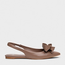 Sapatilha slingback em couro, com salto flat e bico fino. O modelo conta com tira traseira com elástico, na lateral, que se adapta no pé, e laço no cabedal que adiciona um toque romântico.