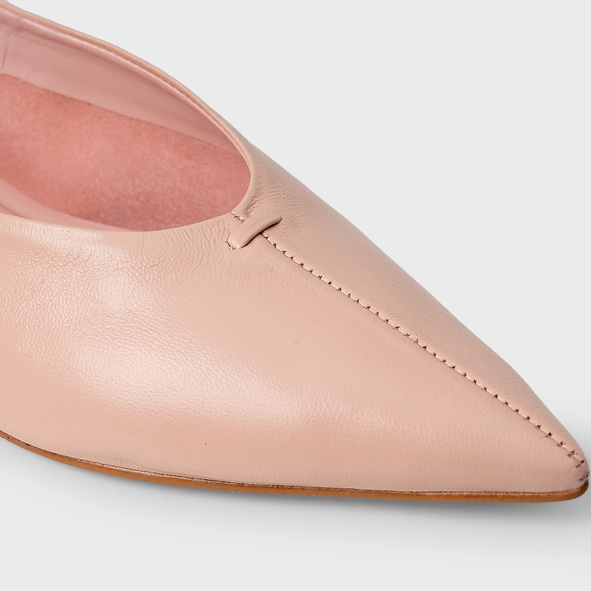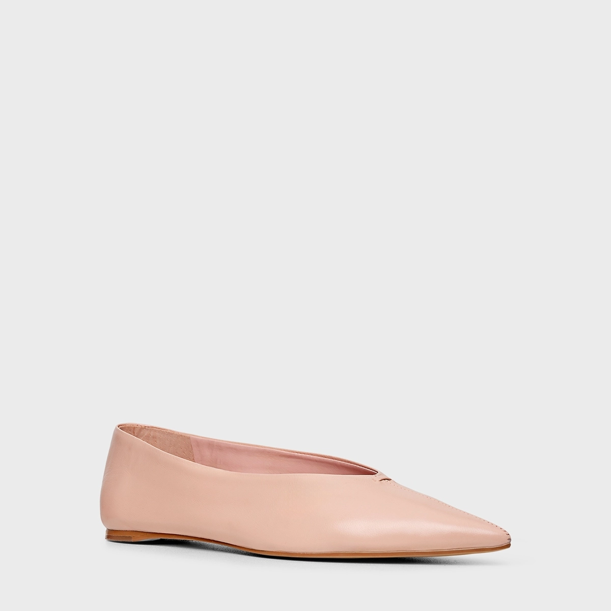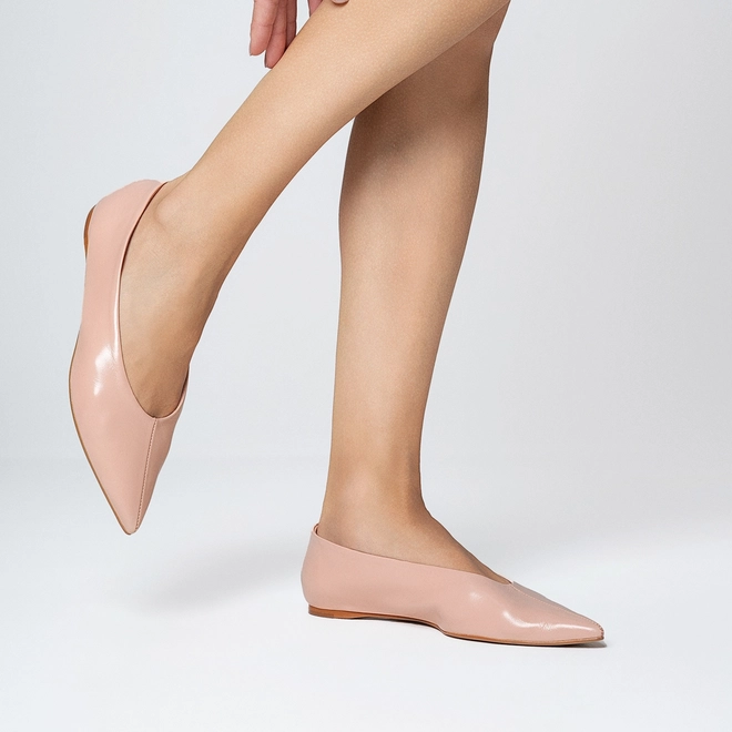Sapatilha de couro com salto baixo e bico alongado fino, com shape clean e totalmente liso.