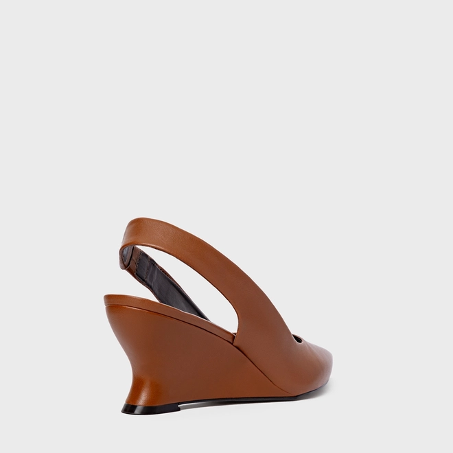 Scarpin slingback em couro com bico fino. Possui salto anabela e elástico traseiro para facilitar o calce.