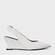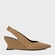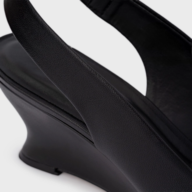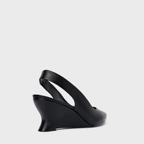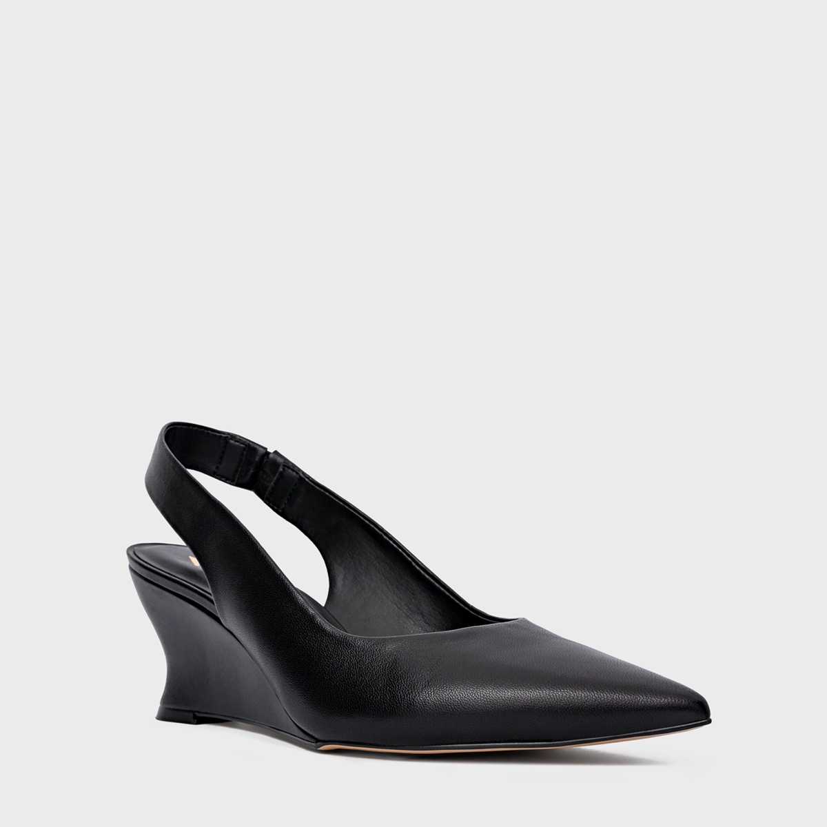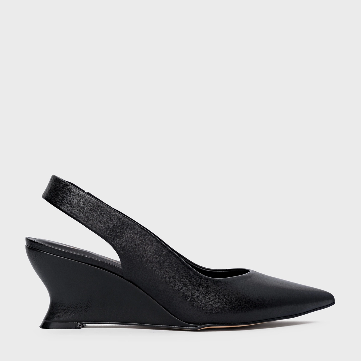 Scarpin slingback em couro com bico fino. Possui salto anabela e elástico traseiro para facilitar o calce.