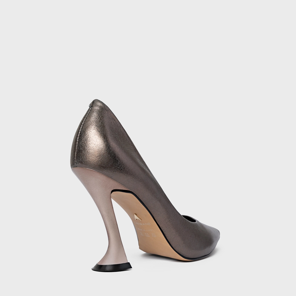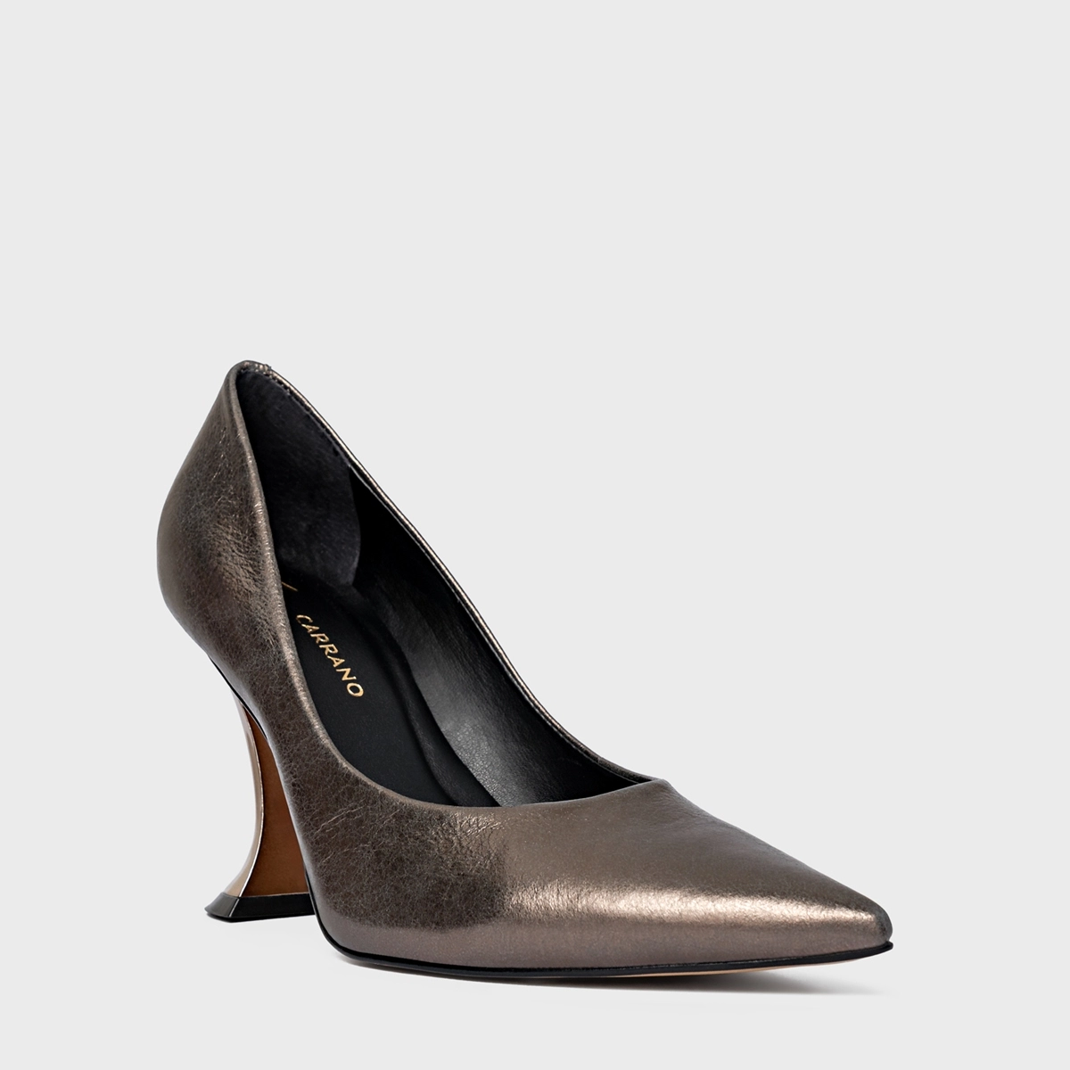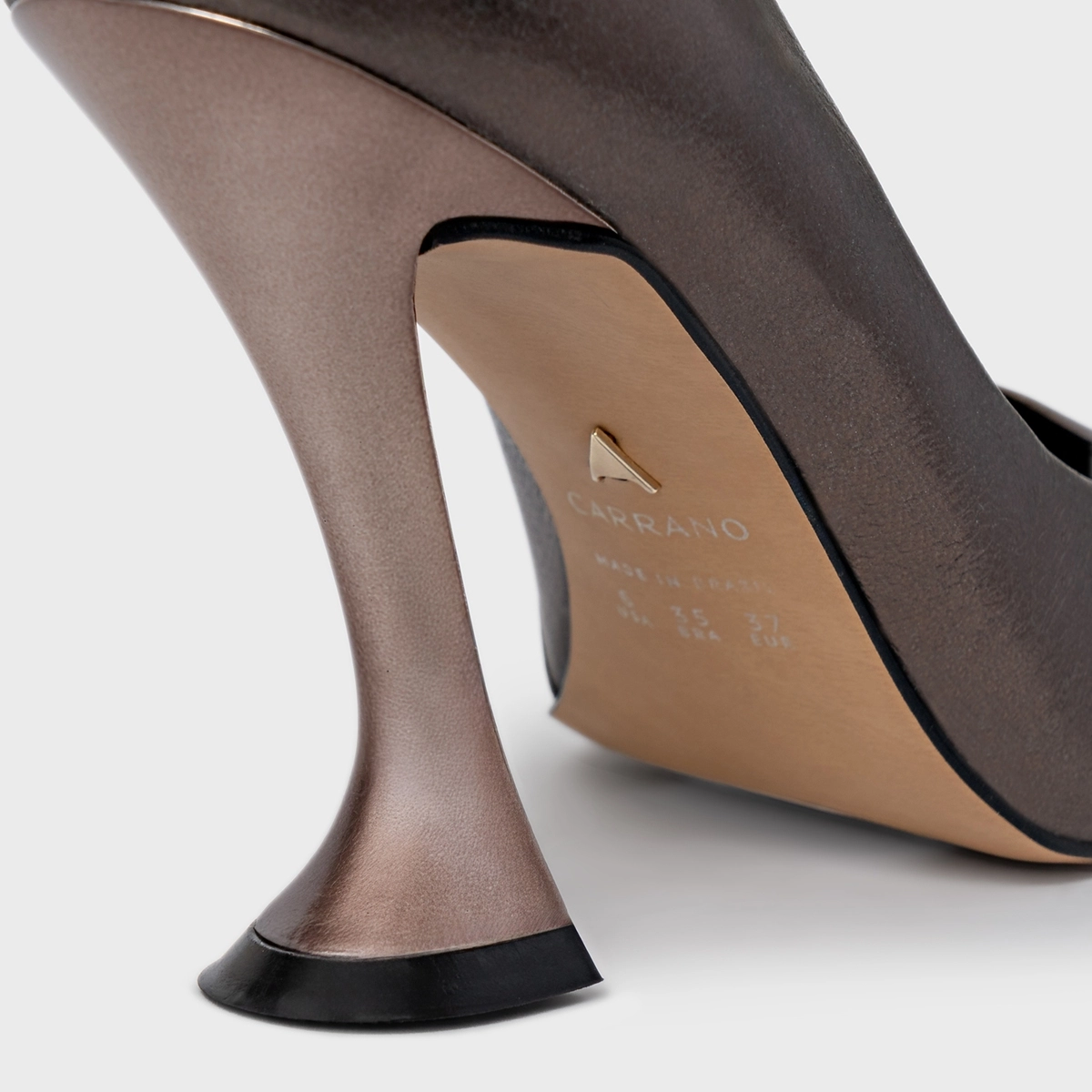 Scarpin em couro metalizado, com bico fino e salto em formato curvado. O modelo apresenta cabedal liso e decote arredondado.