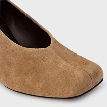 Scarpin em couro suede, com bico alongado quadrado e salto fino. Possui cabedal fechado e design clean.