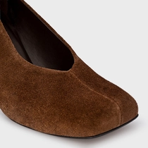 Scarpin em couro suede, com bico alongado quadrado e salto fino. Possui cabedal fechado e design clean.