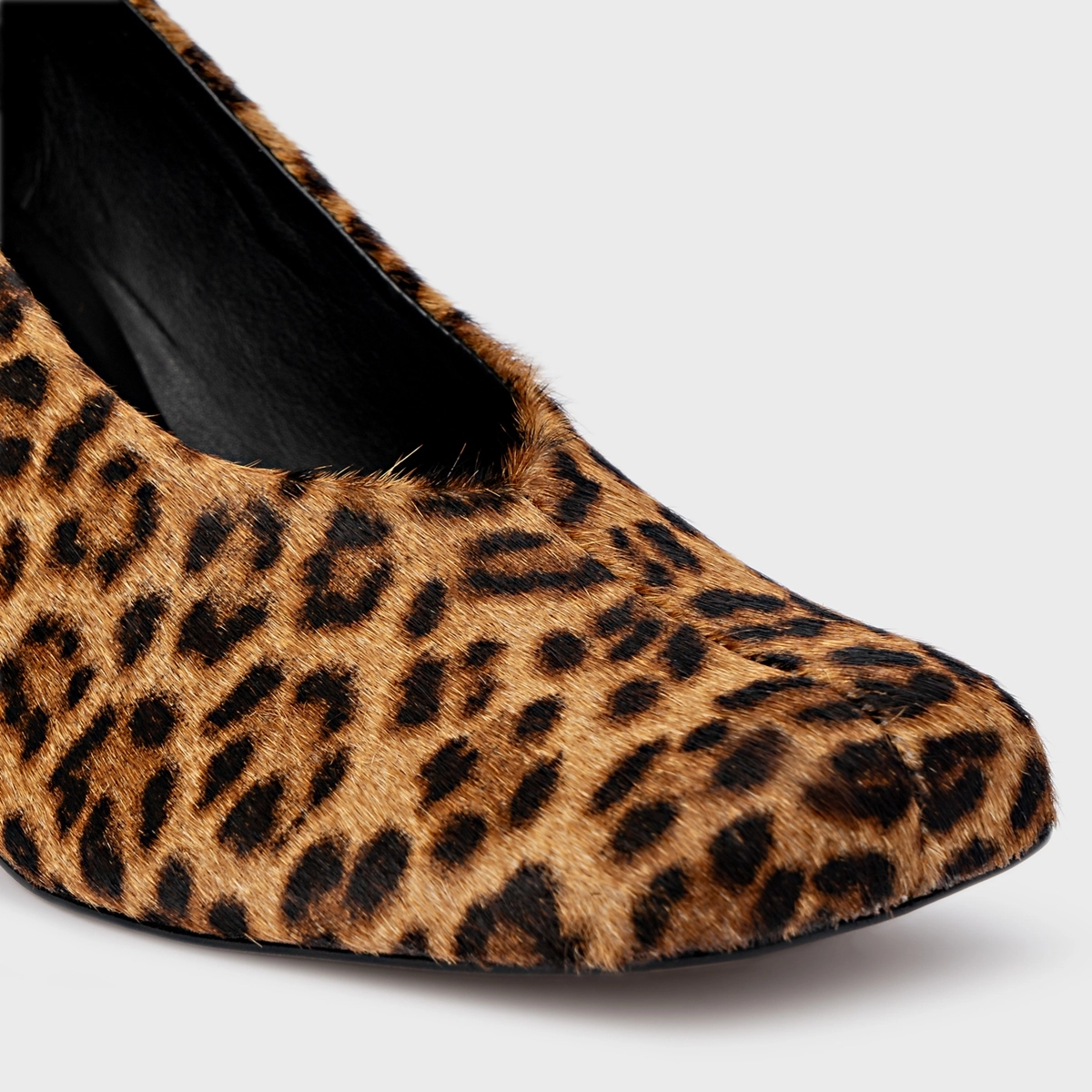 Scarpin em pelo com estampa animal print, com bico alongado quadrado e salto fino. Possui cabedal fechado e design clean.