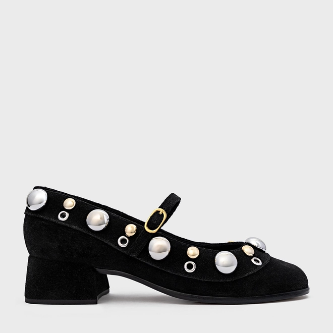 Scarpin Boneca Mixed Balls Salto Bloco Couro Suede Preto