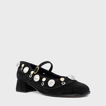 Scarpin estilo boneca em couro suede, com salto bloco e bico arredondado. Possui tira no peito do pé com fechamento por fivela em metal dourado, além de adornos aplicados no modelo.
