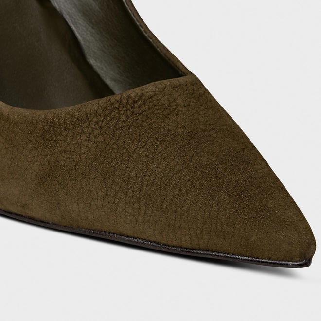 Por que apostar? Esse scarpin em couro nobuck, com seu salto oval arredondado, oferece um visual sofisticado e elegante, ao mesmo tempo em que assegura conforto e estabilidade durante o uso. Como usar? Combine peças fluidas, como batas e jaquetas com franjas, para criar uma mistura descontraída. Para um look mais sutil, deixe o scarpin como ponto de destaque — aposte em um blazer alongado e bermudões para um visual sofisticado e equilibrado.
