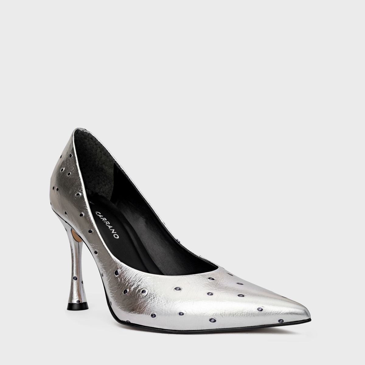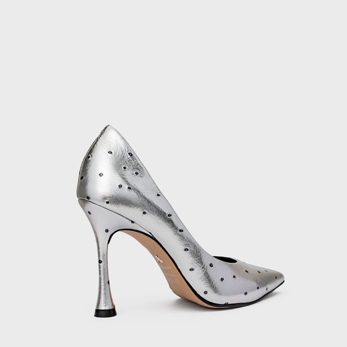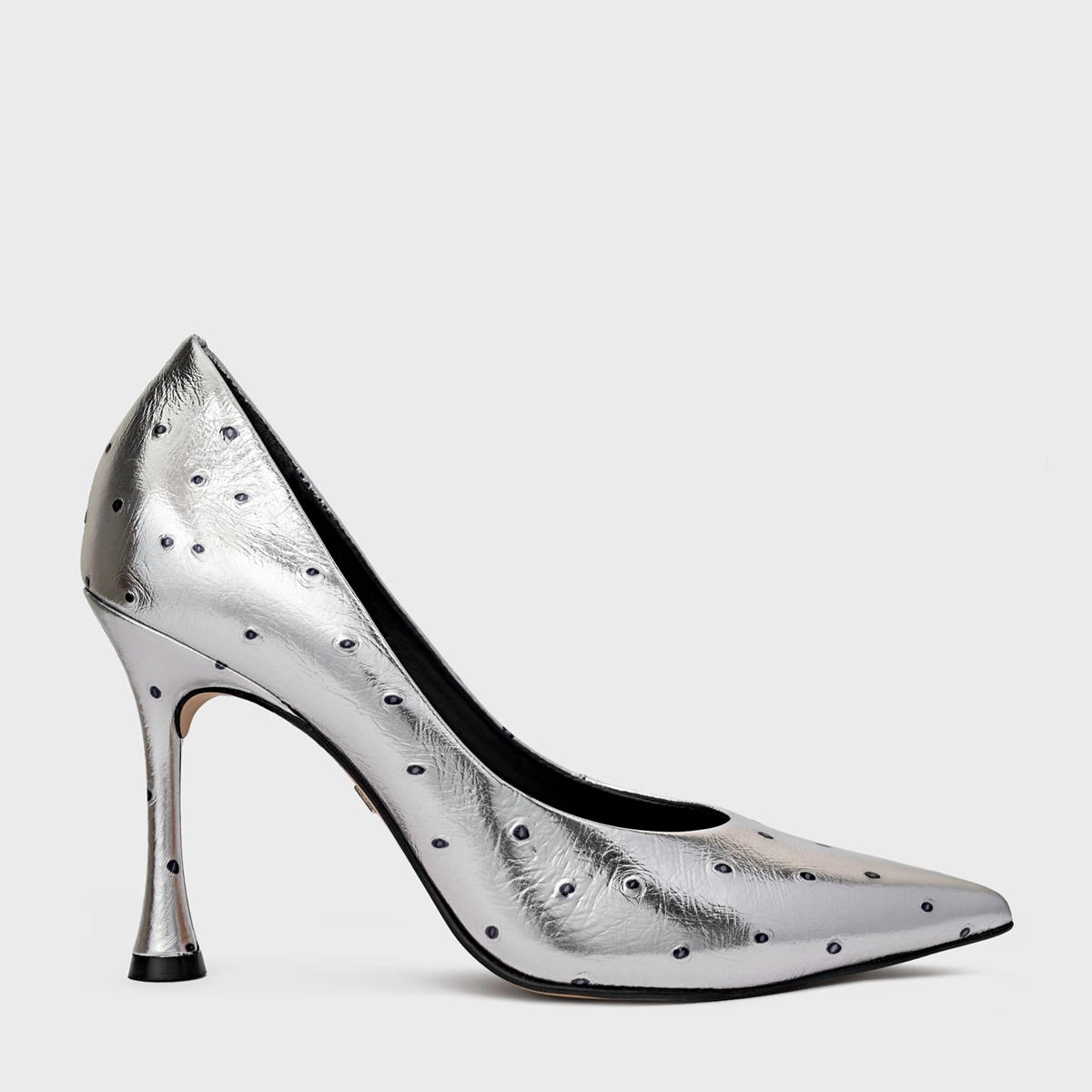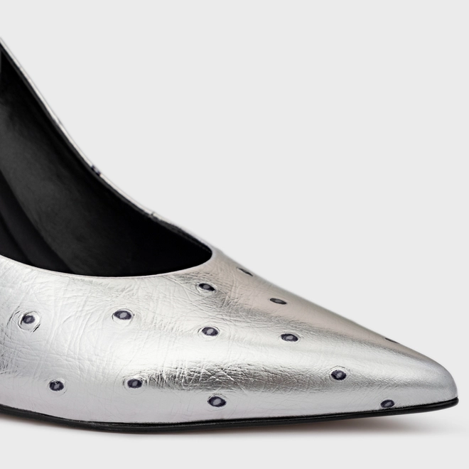 Scarpin em couro com textura que imita couro de avestruz com elementos metálicos. Bico fino e salto fino. Acompanha a anatomia do pé, prezando pelo conforto e estabilidade na hora do calce.
