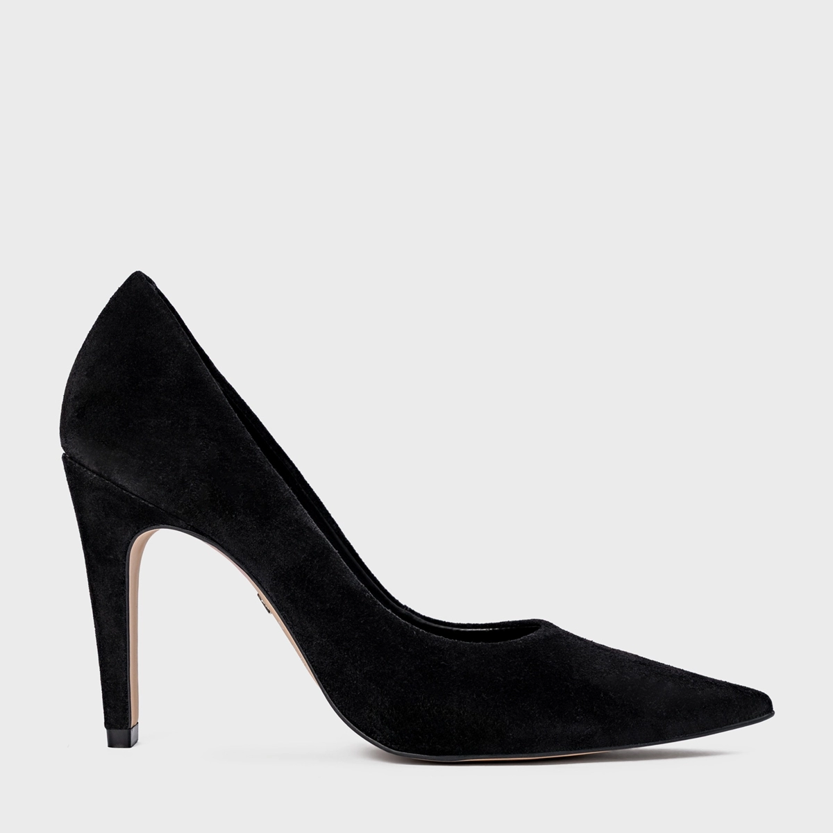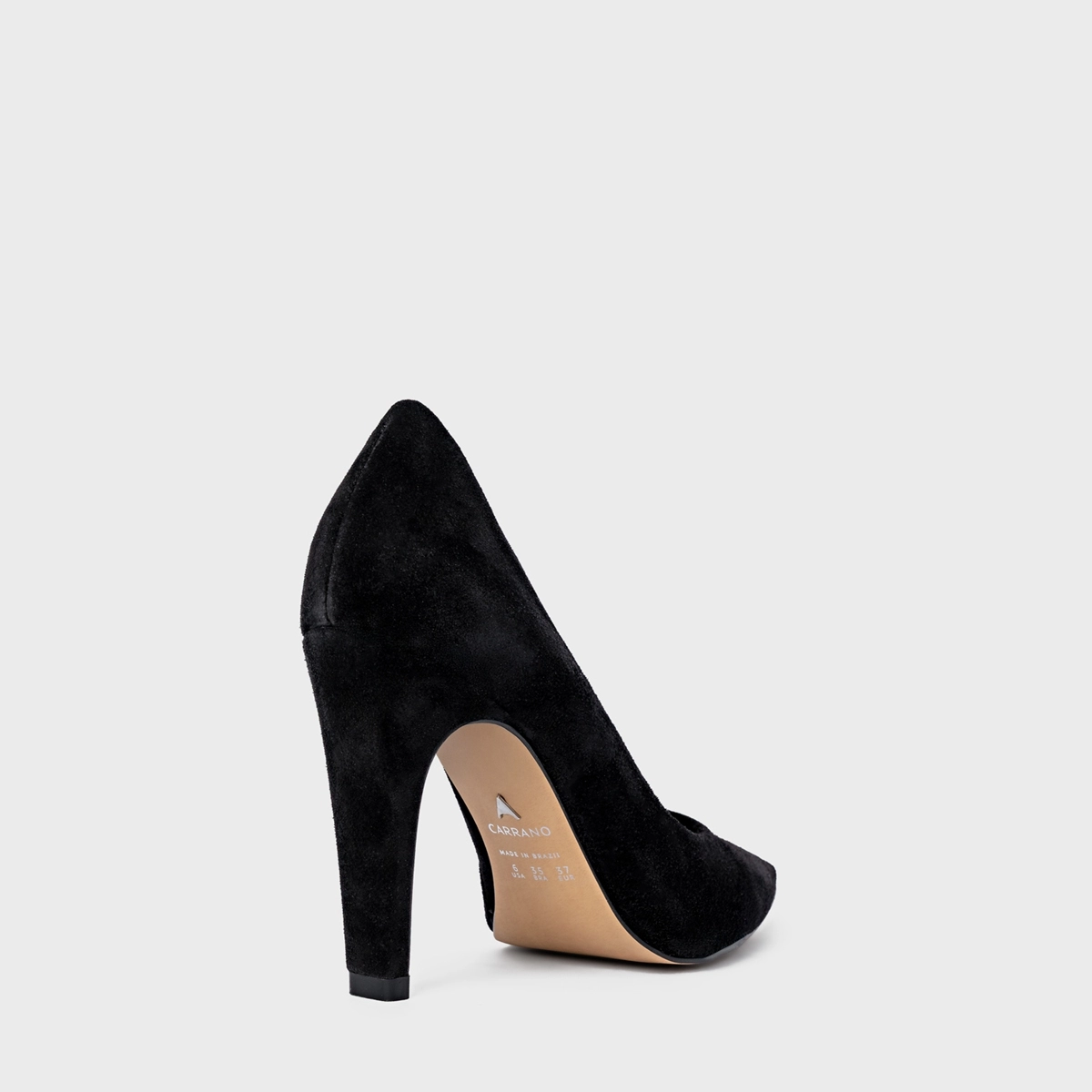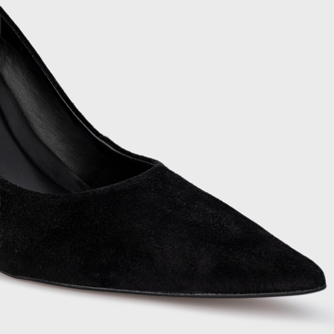 Scarpin em couro suede. O modelo possui salto alto com uma largura mais robusta do convencional. Bico fino alongado e decote arredondado.