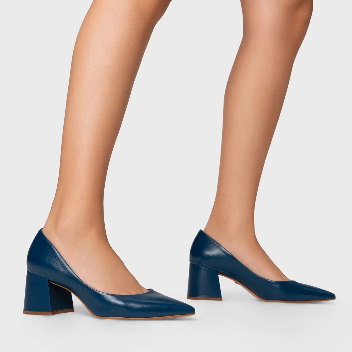 Scarpin de couro, bico fino e salto bloco médio. Acompanha a anatomia do pé, prezando pelo conforto e estabilidade na hora do calce.
