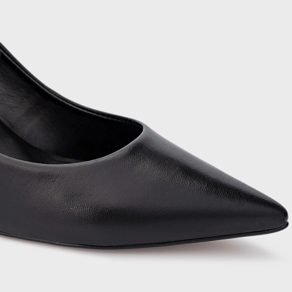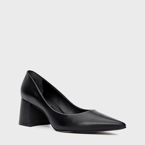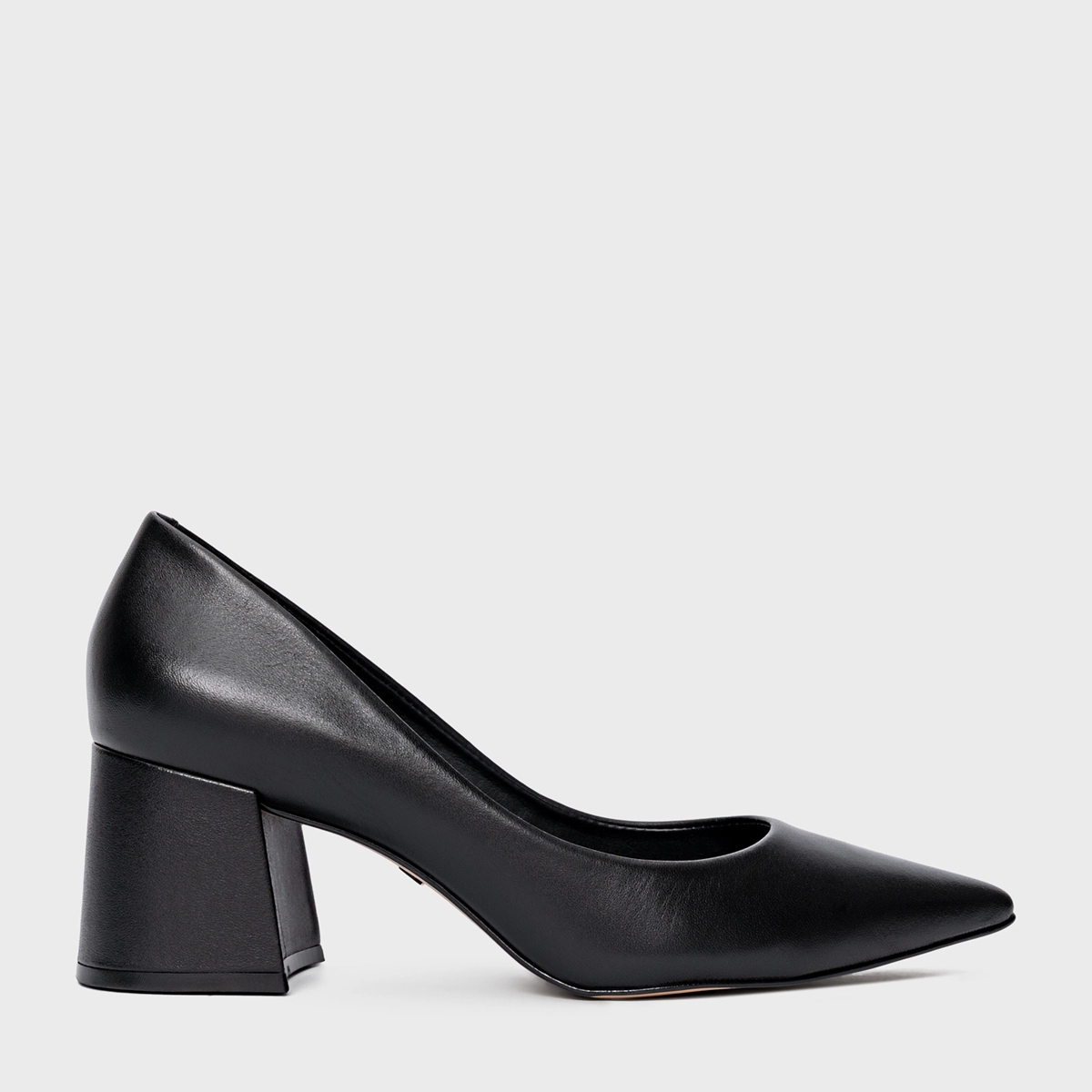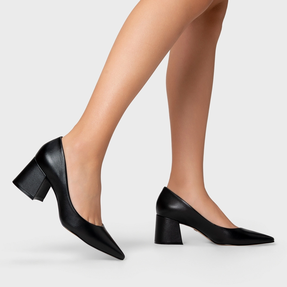 Scarpin de couro, bico fino e salto bloco médio. Acompanha a anatomia do pé, prezando pelo conforto e estabilidade na hora do calce.