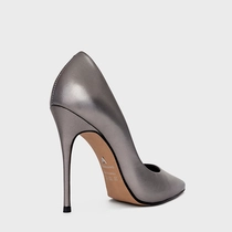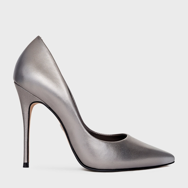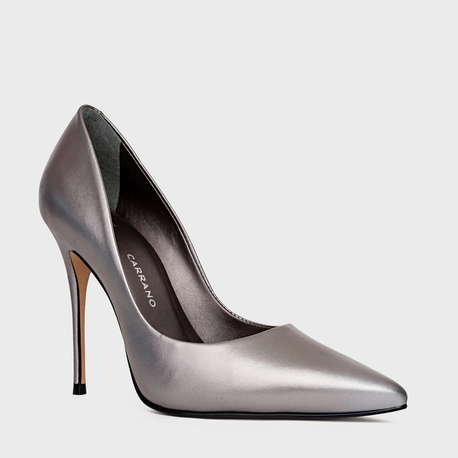 Scarpin Loretta Salto Fino Couro Metalizado Prata Antigo