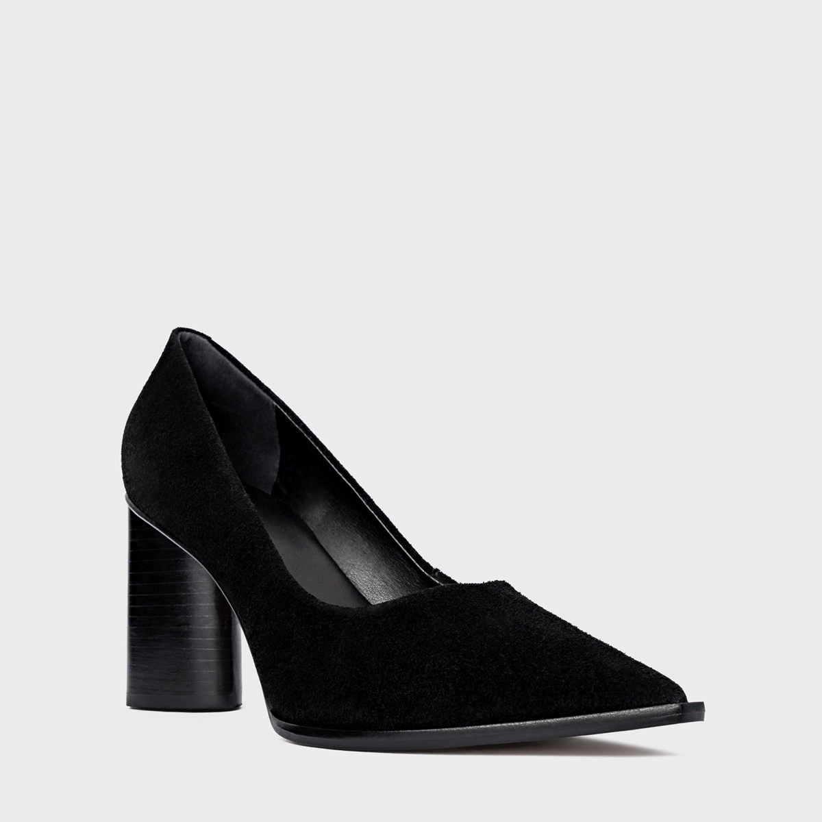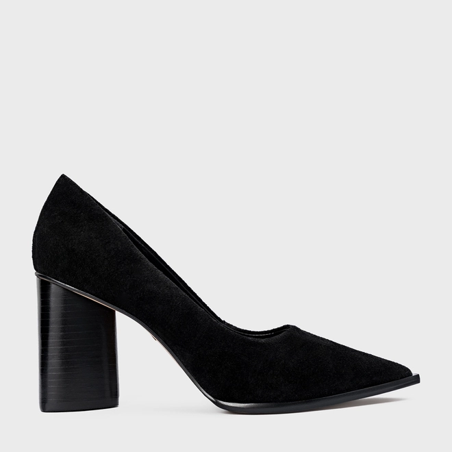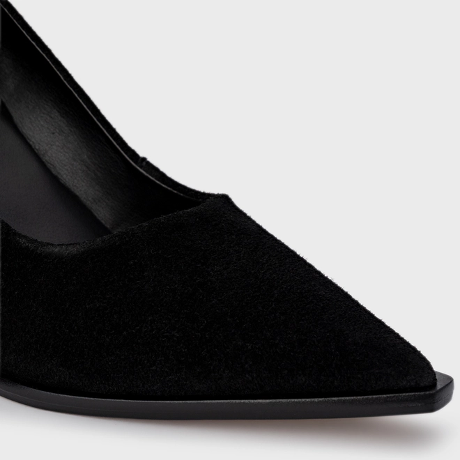 Scarpin em couro suede, com bico fino e salto oval. Possui cabedal fechado e decote arredondado.