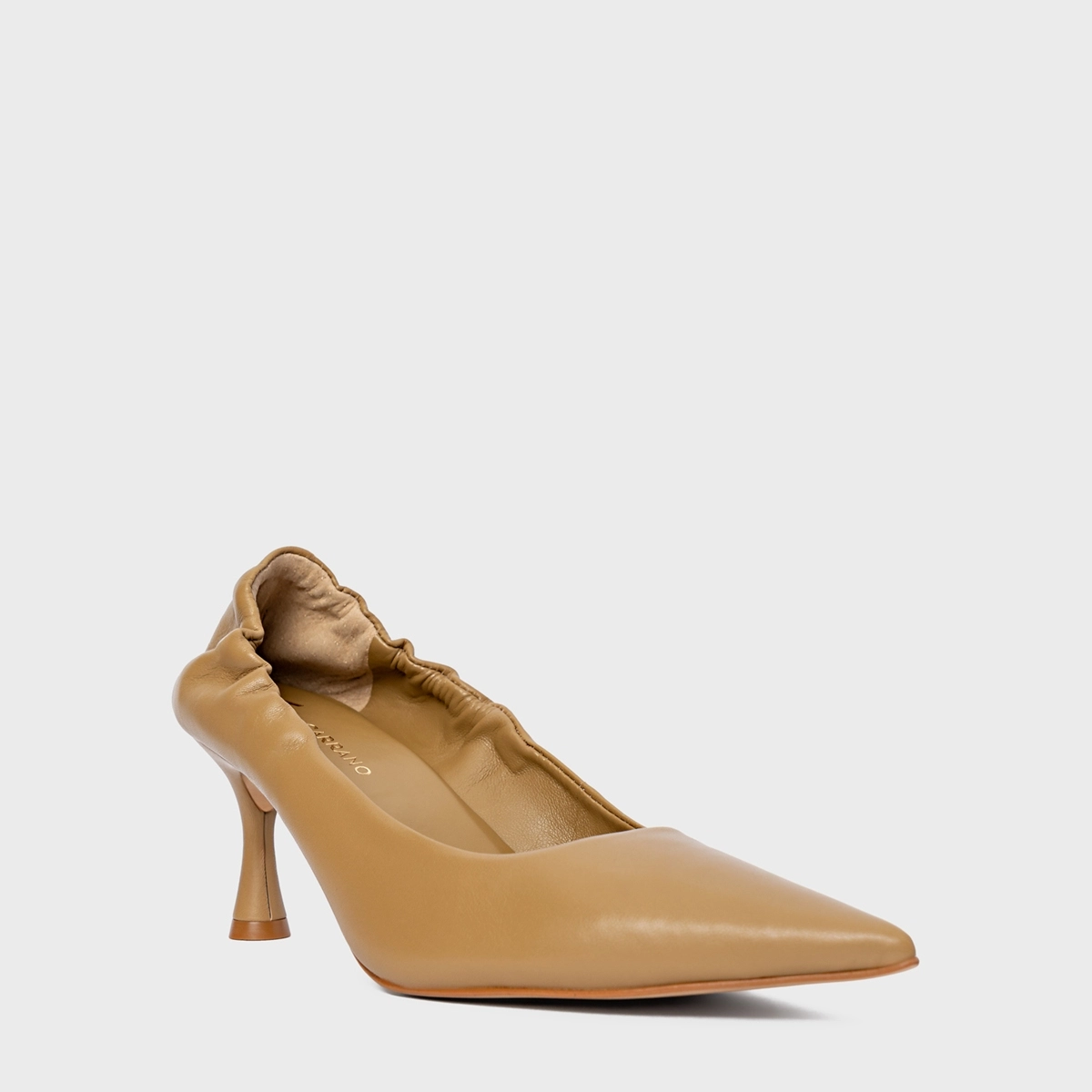Scarpin em couro, com bico fino e salto fino. Possui cabedal fechado e detalhe franzido na parte traseira.