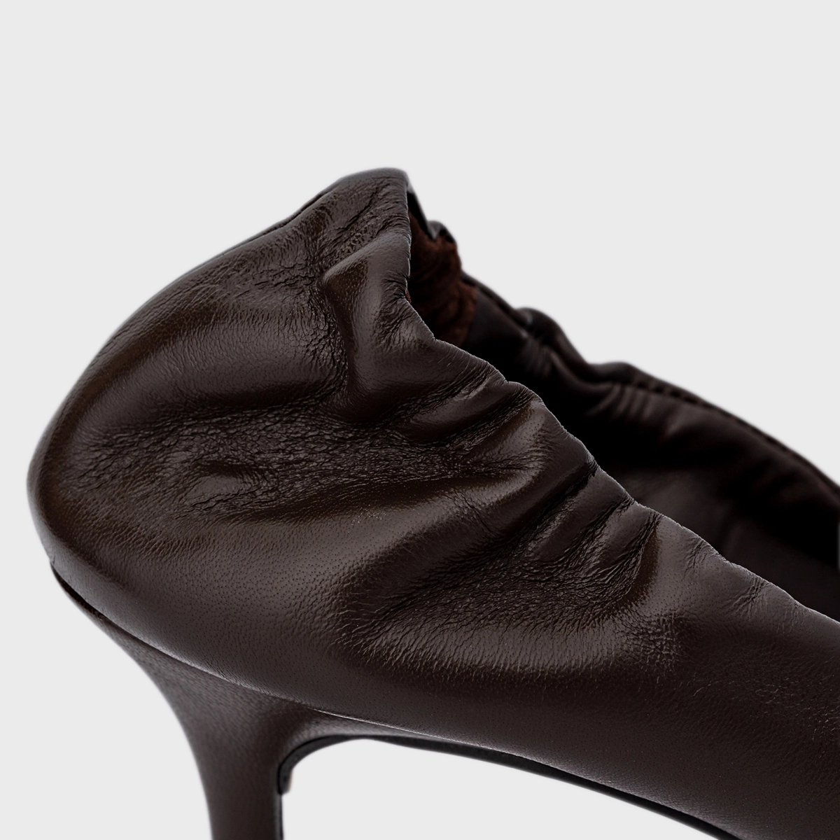 Scarpin em couro, com bico fino e salto fino. Possui cabedal fechado e detalhe franzido na parte traseira.