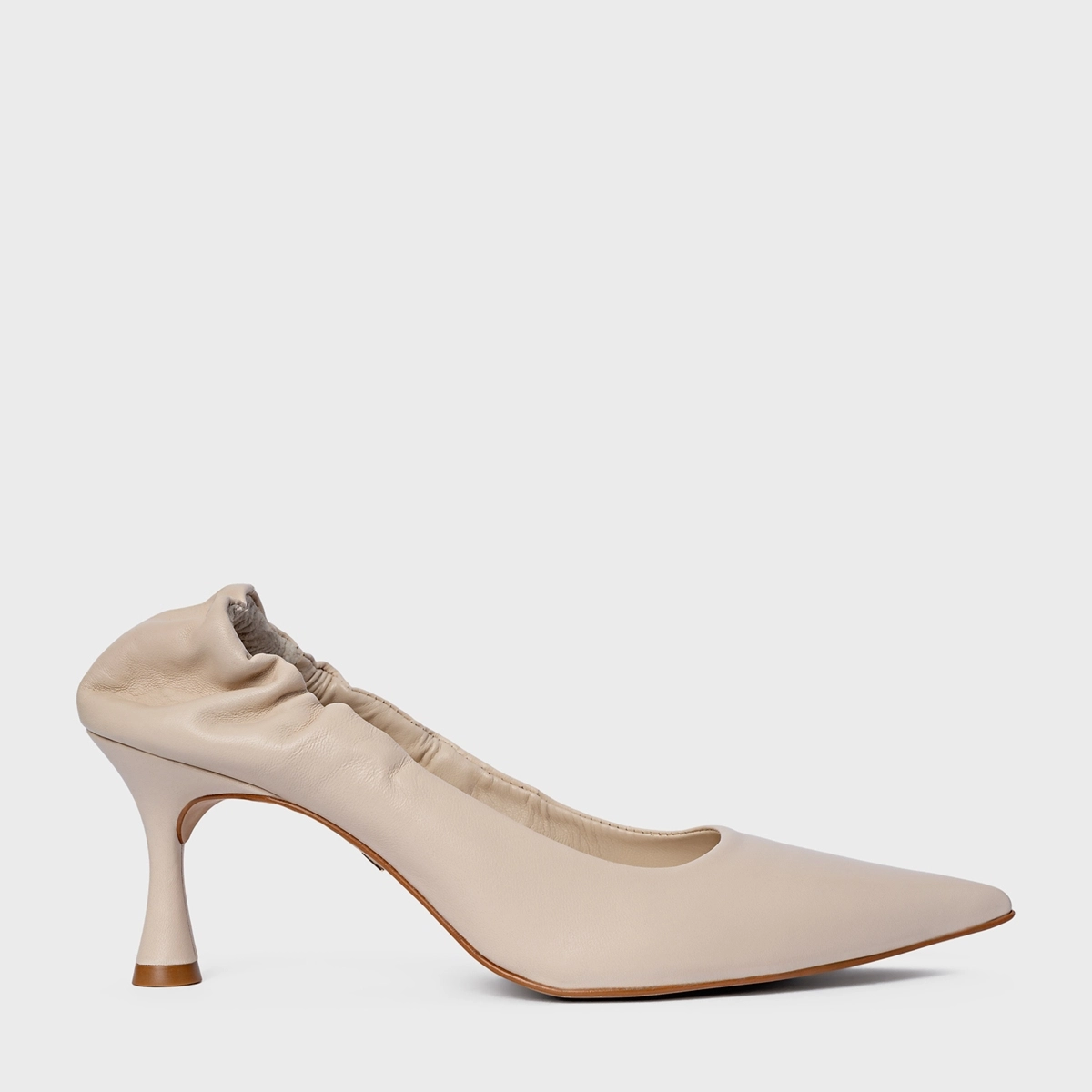 Scarpin em couro, com bico fino e salto fino. Possui cabedal fechado e detalhe franzido na parte traseira.