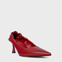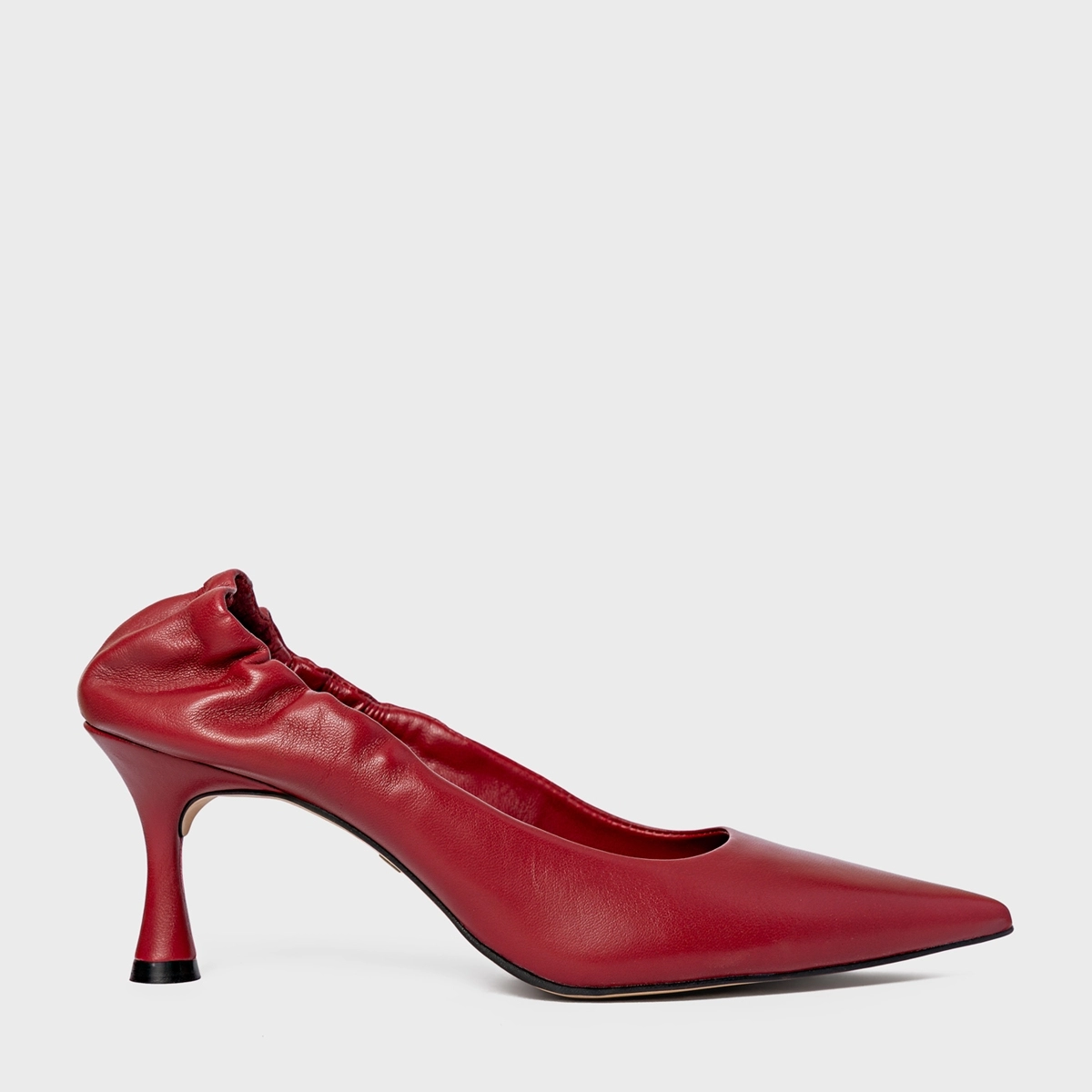 Scarpin em couro, com bico fino e salto fino. Possui cabedal fechado e detalhe franzido na parte traseira.