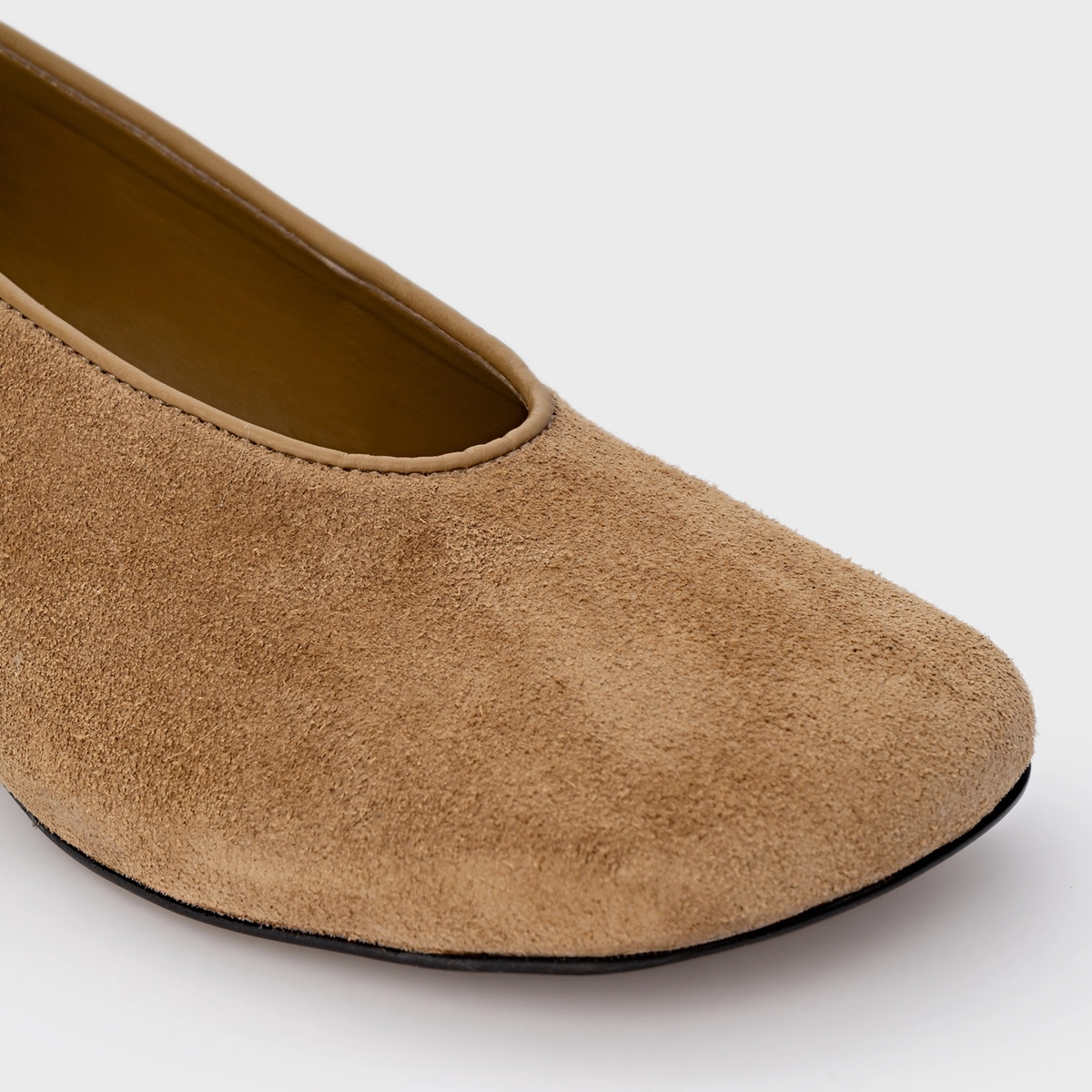 Scarpin em couro suede com bico e decote arredondados. Possui salto médio de formato oval.