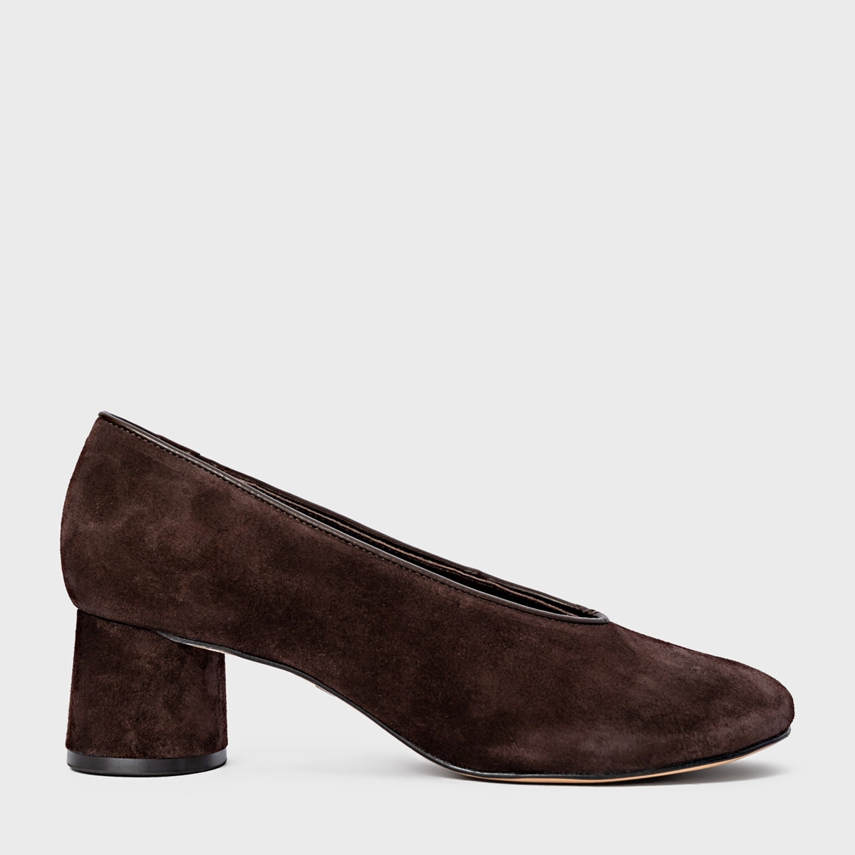 Scarpin em couro suede com bico e decote arredondados. Possui salto médio de formato oval.