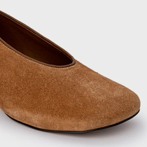 Scarpin em couro suede com bico e decote arredondados. Possui salto médio de formato oval.