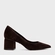 Scarpin em couro suede, com bico fino e salto bloco. Possui cabedal fechado e decote arredondado.