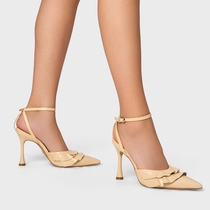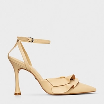 Scarpin de couro com salto alto estilo pino e bico fino. Destaque para o detalhe em couro com efeito de babados no cabedal e fechamento por fivela ajustável no tornozelo.